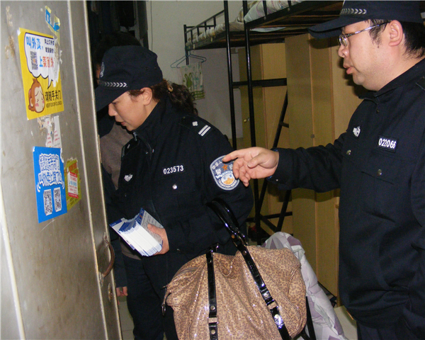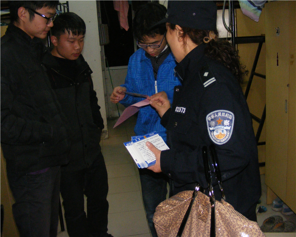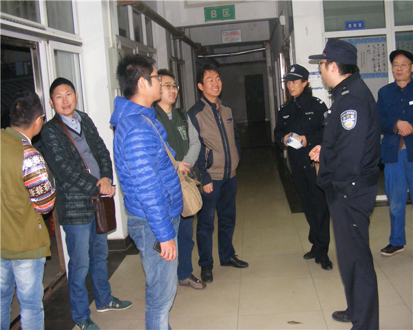 当晚,在关南派出所领导带领下,检查组一行二十余人分成三个小组,分别对我院的学生公寓、经营门店、校内工地上的工棚进行了仔细排查。在学生公寓,检查小组进入寝室向学生发放安全防范知识卡片,传授防骗知识,当晚共发放安全防范知识卡片近千余份。在院内各经营门店,检查组对店内消防设施进行仔细检查,对工作人员进行了登记,嘱咐他们要守法经营,确保安全。在院内建筑工地,检查小组进入工人休息的活动板房内提醒大家注意用电安全,同时严防火灾事故发生。