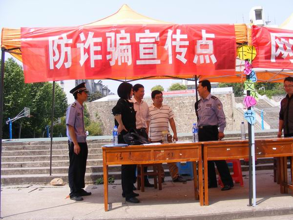 我院副院长黄国赋及铁箕山派出所王所长、耿警官也深入宣传活动现场进行指导。保卫处负责人王江洪同志还向学生深刻阐述了此次宣传活动的目的和意义,并提醒广大学生网络骗子的手法并不十分高明,只要我们提高警惕,对网络好友借钱、网络中奖、网络理财等可疑信息不看、不信、不转账、不汇款,仔细甄别真假网站,保护自身财产安全。