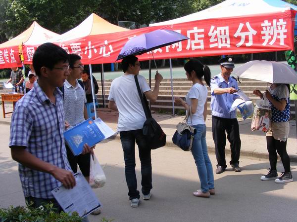 针对常见的网络诈骗手段,保卫处人员以宣讲典型案例、现场解答咨询、悬挂横幅、张贴标语、展示板报等多种形式向学生宣传防范方法;同时通过发放宣传手册、群发短信等方式扩大宣传范围,现场发放了一千余份防骗手册。