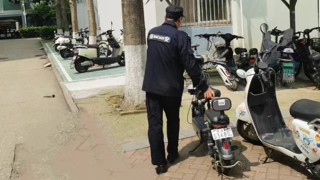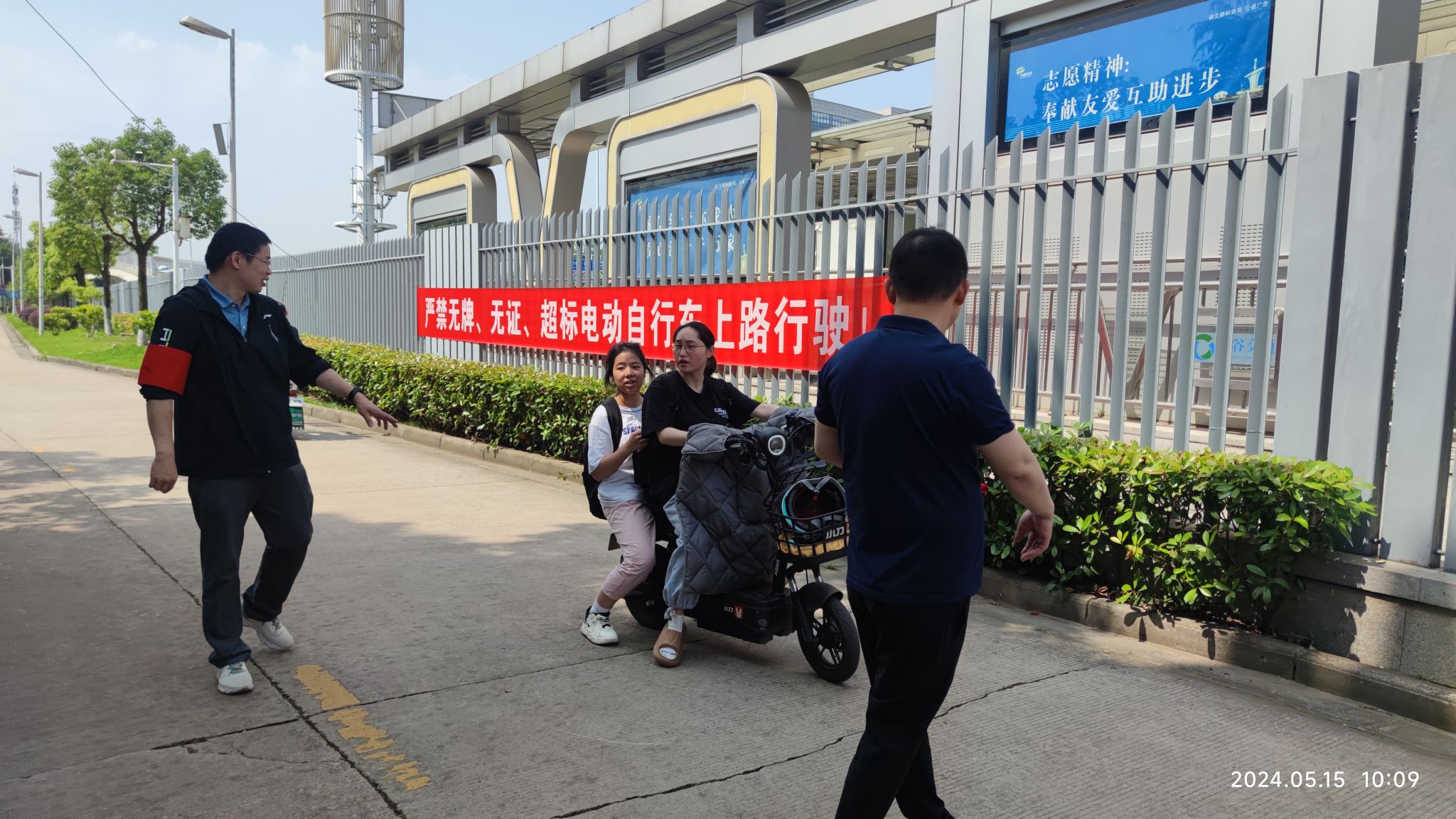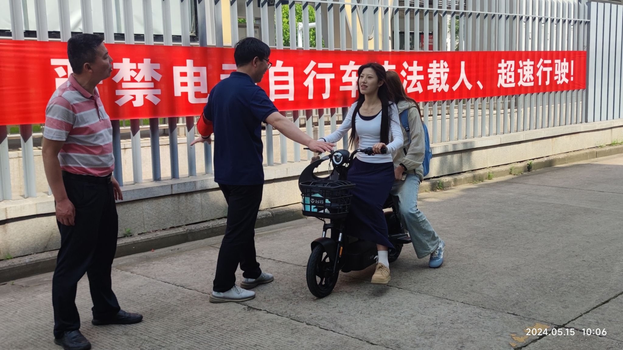 保卫干事、安保队员分成2组,在上下课高峰时段对骑行电动自行车违规载人、超速行驶的学生进行了交通安全教育,提醒学生自行车后座不准搭乘超过12周岁的人员,骑行时速度不能超过25公里/小时,并提醒未上牌的车主尽快办理上牌手续。安保队员加大了巡查力度,对乱停乱放的电动自行车将其迁移至停车位内有序停放。