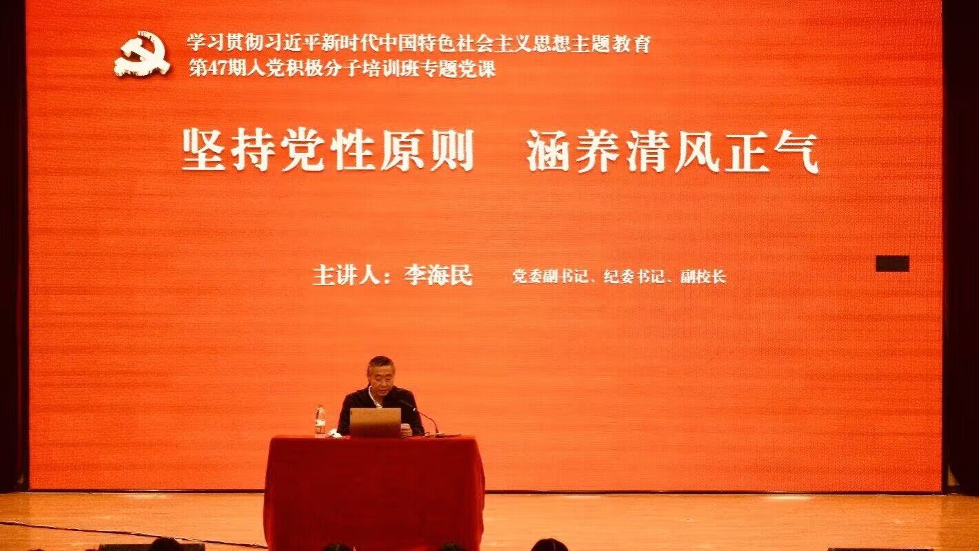 根据学习贯彻习近平新时代中国特色社会主义思想主题教育的工作安排以及领导干部讲党课的工作要求,近日,校党委副书记,纪委书记,副校长李海民为第47期入党积极分子培训班以及2023年第2批发展对象培训班的学员讲授了“坚持党性原则,涵养清风正气”的主题党课。