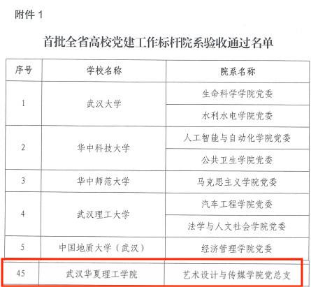 近日,中共湖北省委教育工委公布了首批全省高校基层党建示范创建工作验收通过名单。我校艺术设计与传媒学院党总支通过“首批全省高校党建工作标杆院系”验收,商学院教工第四党支部通过“全省高校党建工作样板支部”验收。