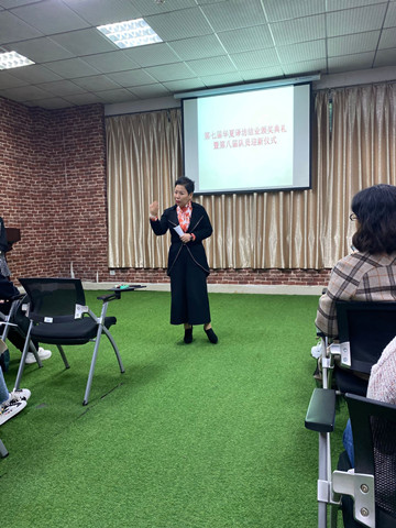 随后,肖凤华院长作开场致辞,肖院长肯定了第七届译坊成员取得的不俗成绩,也因为疫情的原因,对于第七届译坊成员没有办法聚在一起聆听讲座、互相学习、完成翻译工作而深感遗憾。对于新成员,肖院长提出了明确的要求,希望新成员们在把学习搞好的同时,能把热情投入到译坊的工作中,边实践边学习,学有所获。对于第八届新成员,肖院长提出要按照培养研究生的方式来培养精英,两周一次的presentation和接待外宾是展示华夏学生的风采的良好途径,肖院长还指出,平时有空多看看华夏官网,尤其是外文网站,也要了解周边事,了解每天发生变化的华夏,了解我们这个变化的世界。