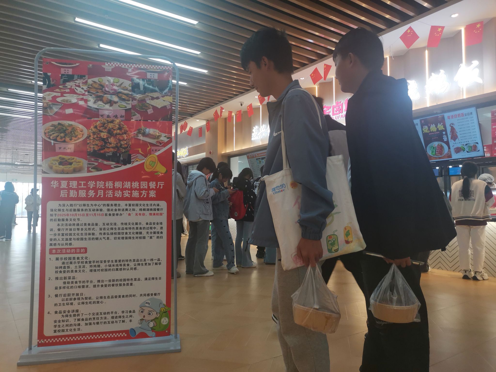 (二)“乐购在华夏”校园惠购服务月活动时间:10月15日至11月15日。活动方式:在学校校园餐厅、校内商业门店设置特惠服务区或特惠服务品种,由食堂、超市、商业门店等服务网点结合自身实际采取直接折扣特惠、特价套餐、现场抽取优惠券等相结合的形式面向梧桐湖校区学生提供特惠菜品或商品,同时现场进行“食品安全、健康饮食”宣传。