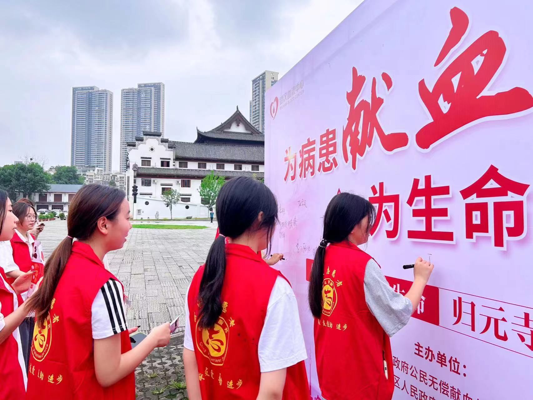 2024 年 6 月 20日,一场充满爱心与善意的献血志愿者活动在归元寺景区广场举行。在校团委的指导下,艺术设计与传媒学院团总支组织心理健康协会29余名队员担任了此次活动的志愿者,上午9时,身着红色志愿者服装的大学生们,在汉阳区琴台社区居民委员周丁书记带领下,赴归元寺景区广场进行志愿服务。志愿者们在景区广场上设立了宣传摊位,摆放着醒目的献血知识展板,号召大家前来参与献血活动。