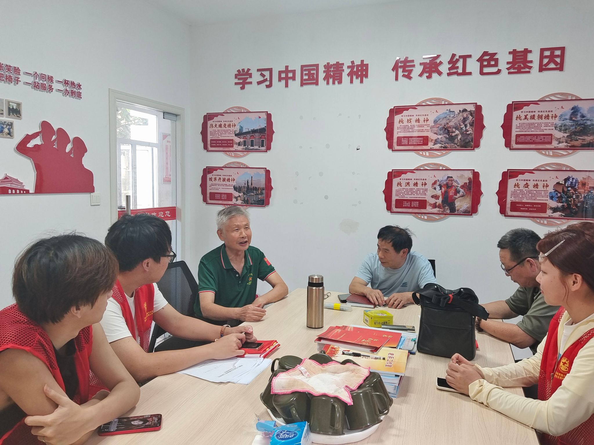 随后,实践队与“金色号角”退役军人志愿服务队代表张旭德、房汉一就新时代基层党建情况这一重要议题展开了深入交流。张旭德首先对实践队的到来表示热烈的欢迎,接着结合实际情况简单阐述了新时代基层党建工作相关内容,最后以宣讲活动中的所思所感结尾,收到了阵阵掌声。房汉一则从党建工作和退役军人工作之间的关系作为切入,他说“我们组建这一支老兵志愿服务队,把分散在社区里的退役老兵群体紧密团结起来,通过志愿服务发挥退役军人在基层党建工作中的作用,既能充分展现退役军人的精神风貌,又能有效提升基层党建工作的能力和水平。”实践队成员们认真聆听,积极提问,与老兵们形成了良好的互动氛围。通过此次交流,实践队成员们对新时代基层党建工作有了更深刻的认识,收获了宝贵的经验和启示。