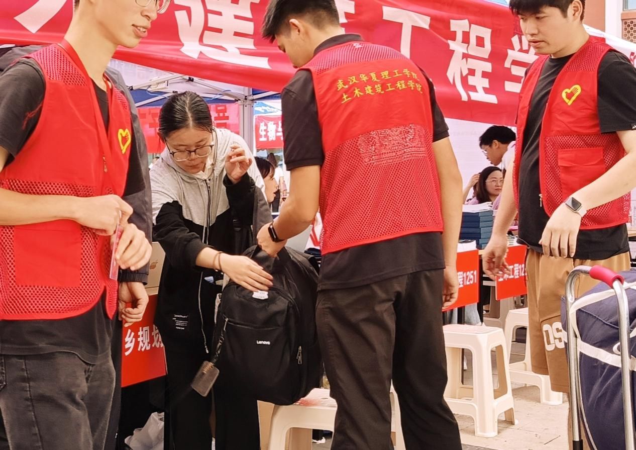 步入迎新现场,属于土建学子浪漫的红色横幅格外醒目,形态各异的迎新展板光彩夺目。身着红色 “土建学院志愿者”马甲的学长学姐们早已整装待发,他们化身“校园向导”,主动上前接过新生手中的行李,一边帮着搬运行李,一边耐心讲解报到步骤:“同学别着急,先在这边登记信息,再去旁边领取宿舍钥匙,有不清楚的随时喊我!” 亲切的话语、热情的身影,瞬间驱散了新生初来乍到的陌生感。