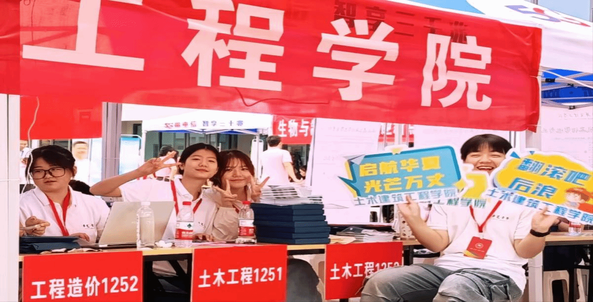 在学校指定迎新区域,土建学院专属迎新点位格外醒目。红底白字的学院标识牌清晰明了,引导志愿者早已整装待发,手持指引牌随时准备为新生提供帮助。