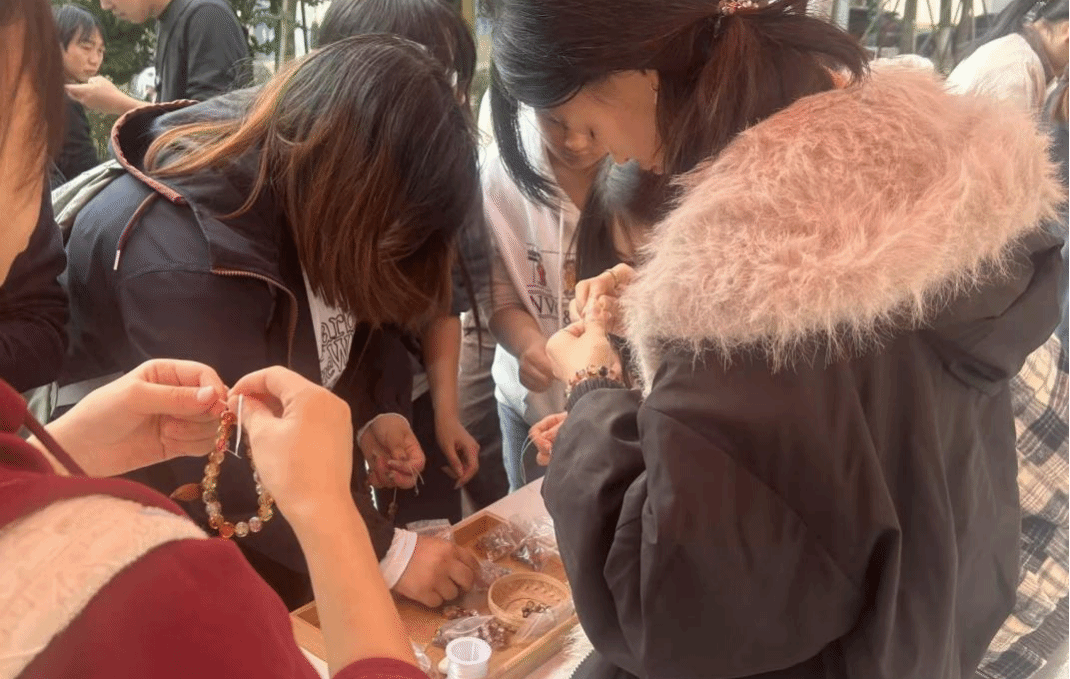 中药手串制作区域同样引人入胜。在焦洁老师的帮助下,同学们通过选材、打磨、串制等工序,将沉香、檀香、决明子等中药材精心编制成药香萦绕的手串。这一过程不仅让同学们了解了中药材的特性,更深刻体会到本草美学与养生智慧的千年传承。