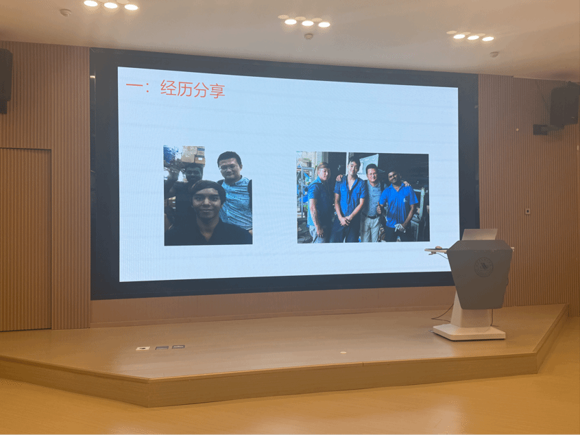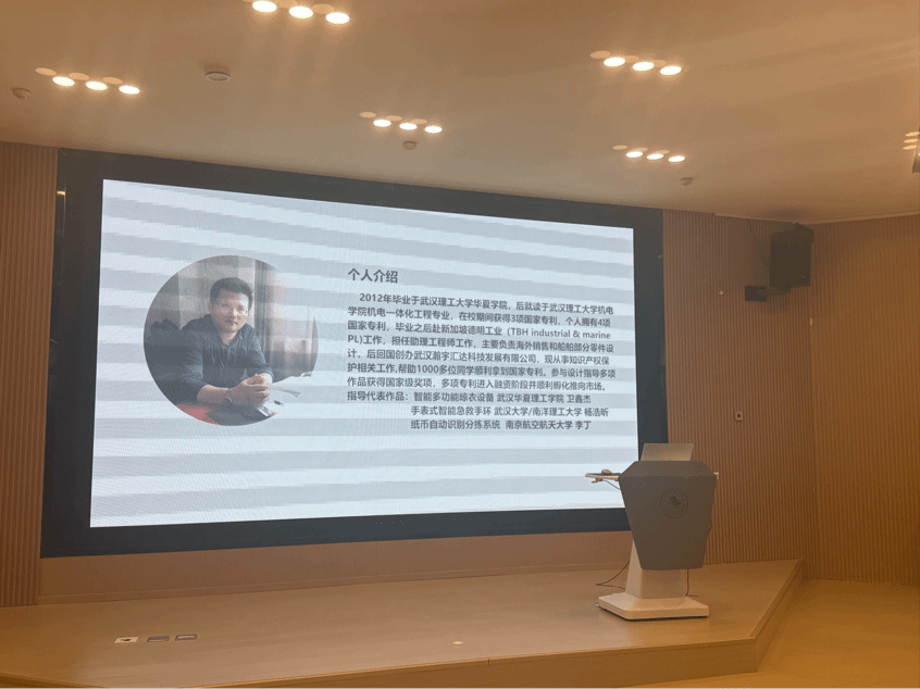 讲座伊始,程旭涛以自身成长轨迹为切入点,讲述从校园到职场的创新探索历程。2012年他毕业于武汉理工大学华夏学院,后攻读武汉理工大学机电学院机电一体化工程专业,在校期间便凭借对机电领域的钻研与创新思维,斩获3项国家专利,个人累计持有4项国家专利。毕业后,他远赴新加坡德明工业(TBH industrial & marine PL)担任助理工程师,负责海外销售与船舶零部件设计工作,现场展示的海外工作纪实照片,让听众直观感受到他在一线实践中积累的技术与经验。回国后,他创办武汉瀚宇汇达科技发展有限公司,专注知识产权保护相关工作,已助力1000余名同学顺利拿到国家专利;同时他还参与指导多项创新作品斩获国家级奖项,多款专利成果完成融资并孵化落地,其中智能功能晾衣设备、手表式智能急救手环、纸币自动识别分拣系统等代表性作品,更是让在场听众真切看到创新从理念到落地的全过程。