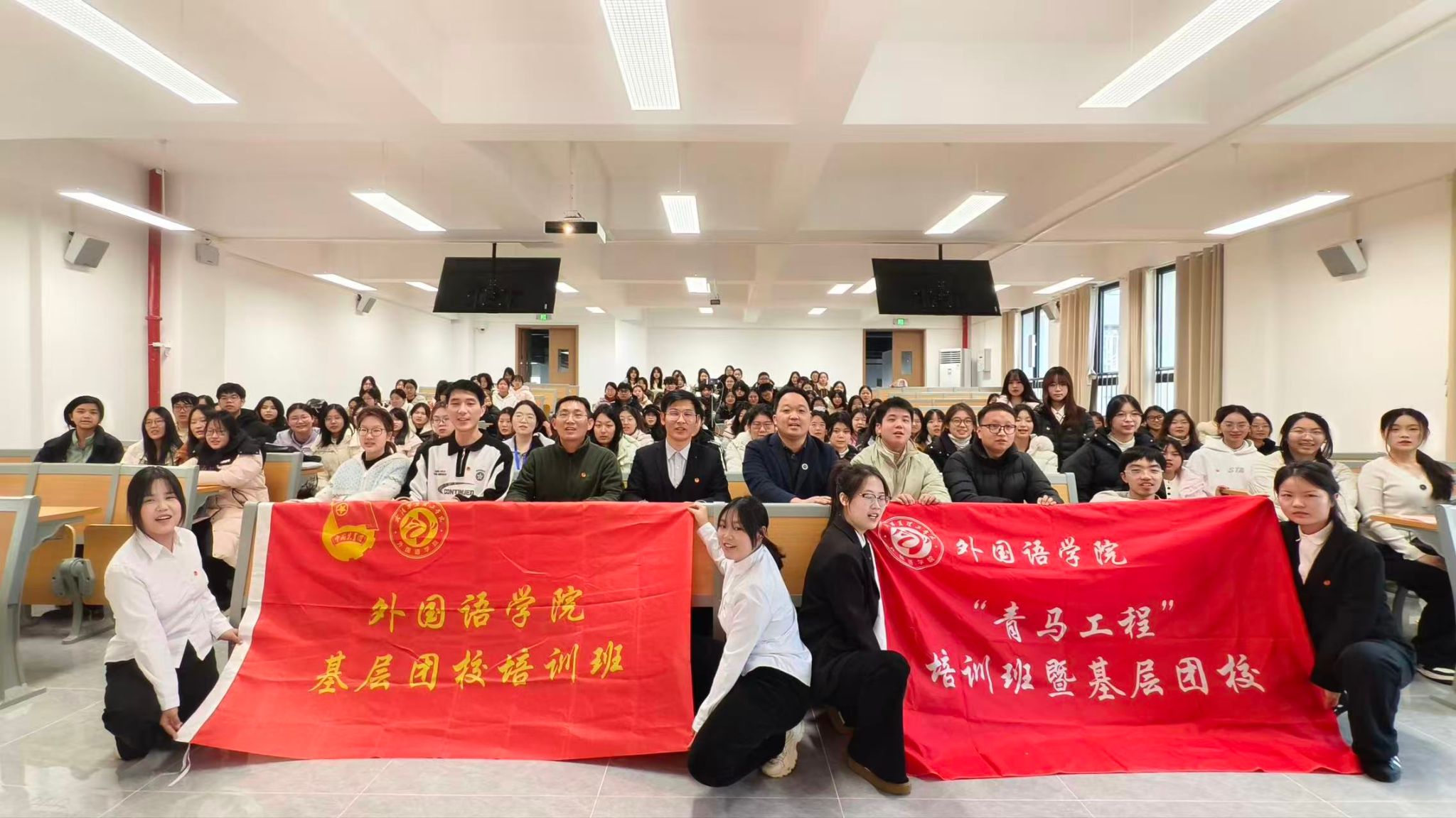 为深入贯彻习近平新时代中国特色社会主义思想,进一步加强学院青年思想政治引领与基层组织建设,同时持续推进优良学风培育,外国语学院于12月25日在梧桐湖校区教学楼B219举行青年马克思主义者培养工程暨基层团校培训班开班仪式与学风建设表彰大会。该大会由校团委副书记史贵鹏,外国语学院党总支副书记马勇、学工办主任陈卓、25级辅导员龚飞、25级辅导员吴碧凯、25级辅导员韦文信等嘉宾老师和24级全体班委,24级全体团干,团属学生组织及2025年4月、10月新发展团员和2025年9月、11月入党积极分子共同参加。
