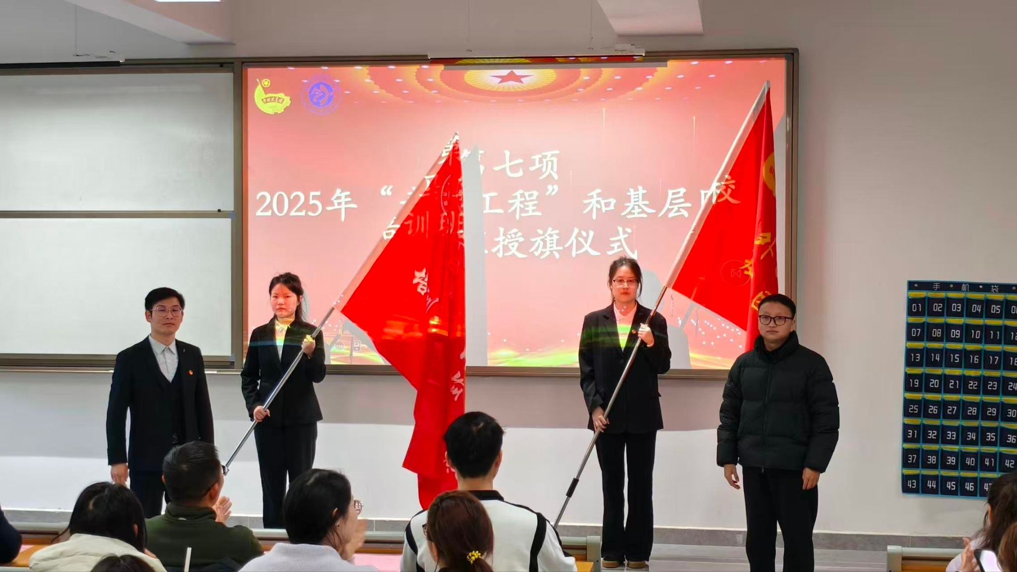 在颁奖环节,学工办主任陈卓老师为“先进班集体”代表颁奖,校团委副书记史贵鹏老师为“优秀学生干部”颁发荣誉证书。紧接着,史贵鹏老师与陈卓老师分别为“青马工程”培训班与基层团校培训班授旗,青马班团支书陈玲和基层团校团支书丰奕鑫同学代表接旗,象征着新一期培训工作的正式启动。