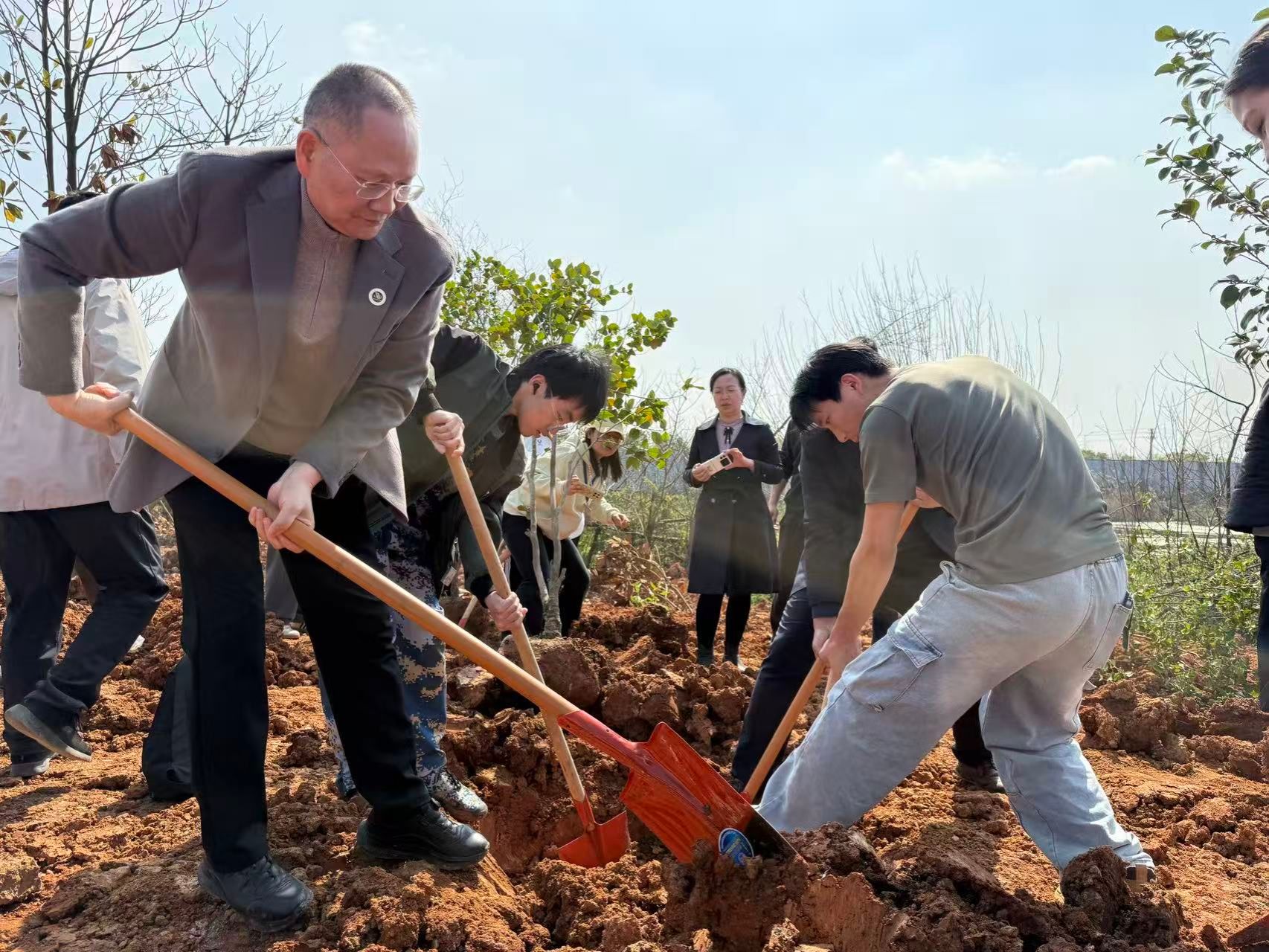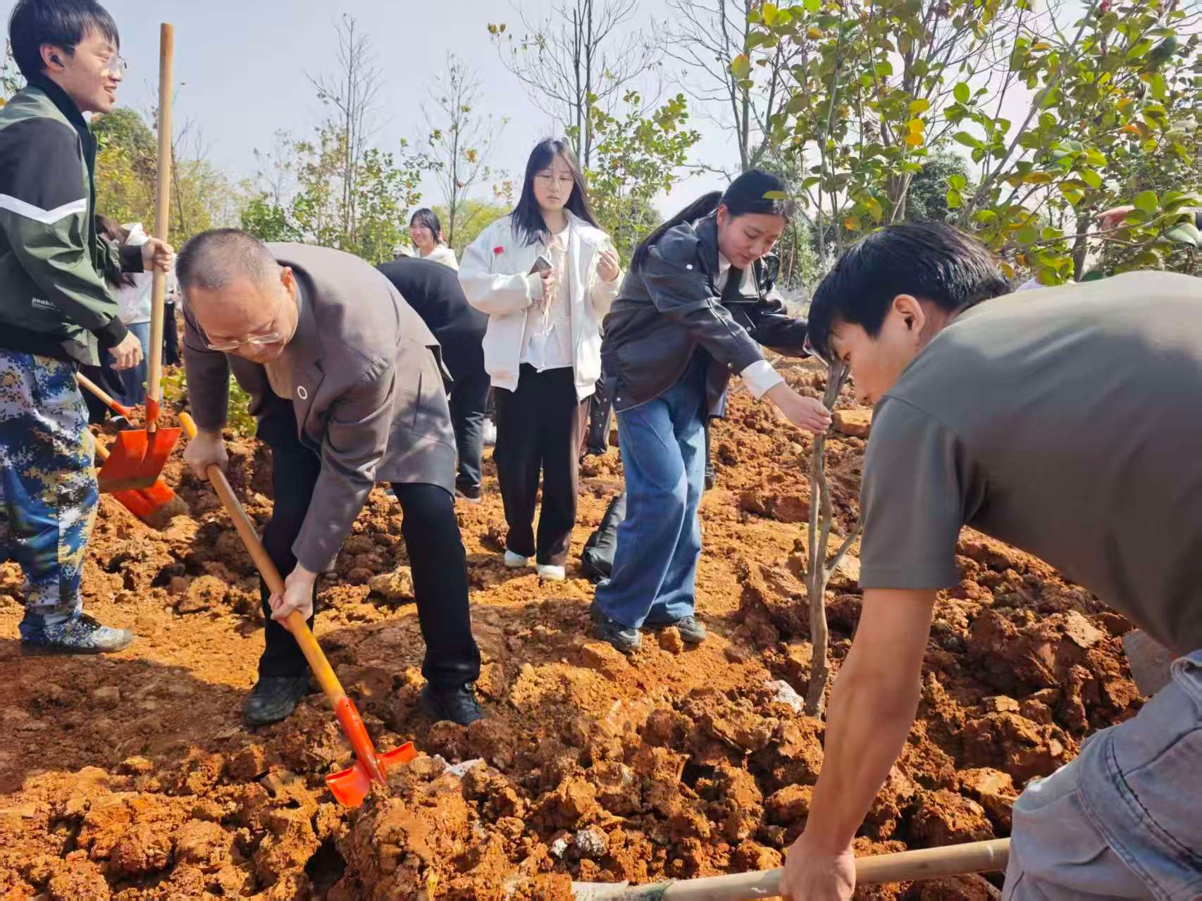 春风吐绿,草木初萌。为进一步增强全体师生的生态环保意识,共建绿色校园,在第48个植树节到来之际,3月12日14时校长吴永桥,副校长李猜,副校长胡水兵,马克思主义学院院长张丽,后勤保障部部长刘源,学院党总支副书记马勇,学工办主任陈卓,25级辅导员龚飞、吴碧凯、韦文信老师及各师生代表在梧桐湖校区积极参与植树节主题活动,以劳动实践为校园增添新绿。