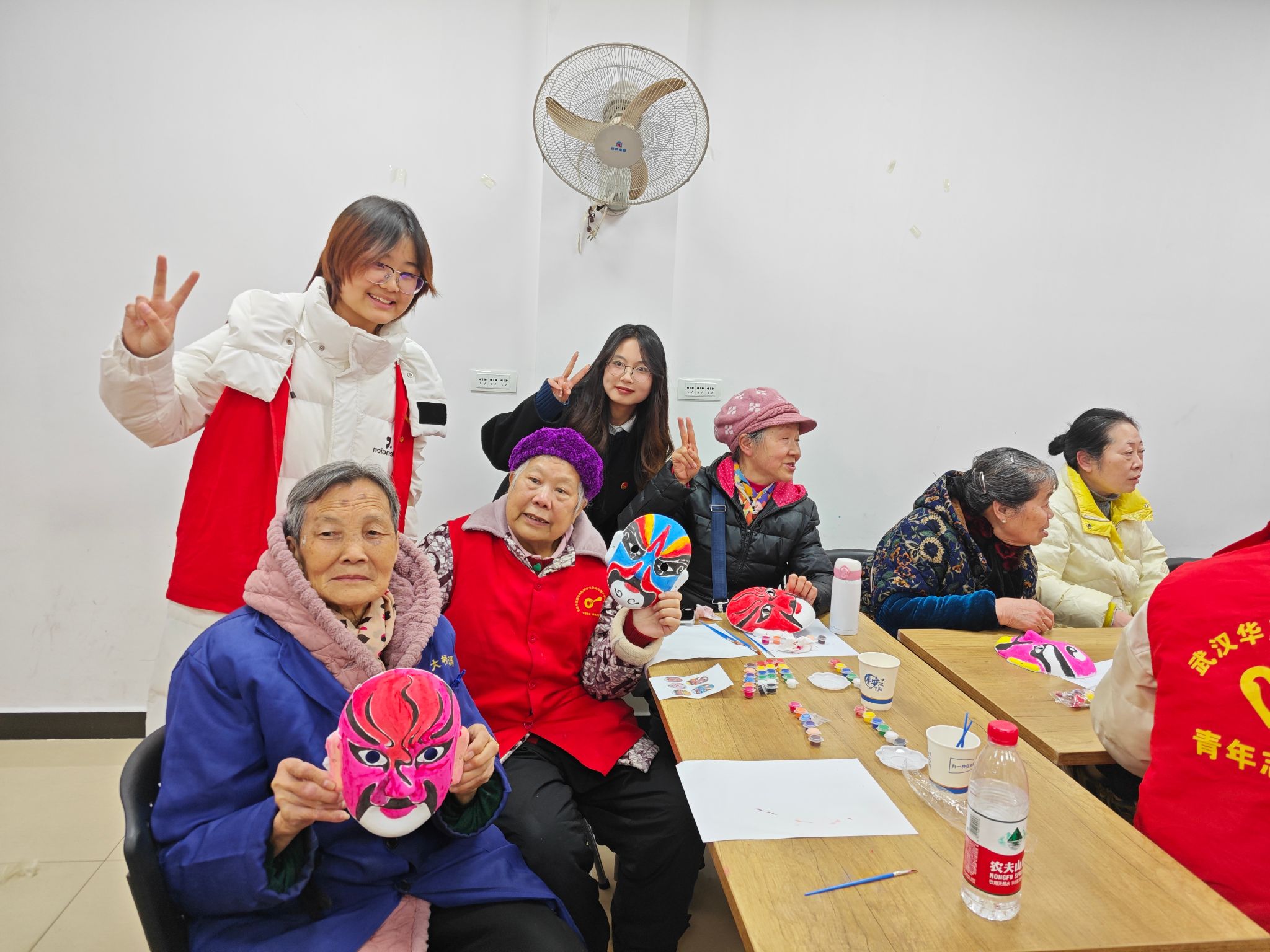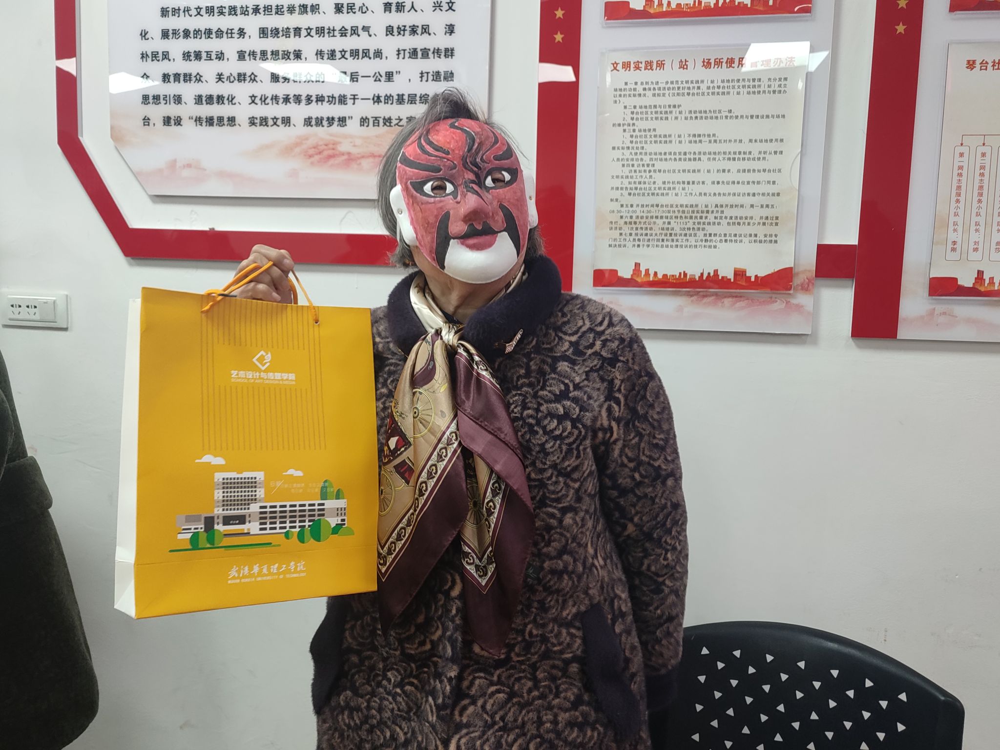 在揭牌结束后,艺术学院团总支志愿者学生代表组织开展非遗助老活动。本次讲解非物质文化遗产为戏曲及脸谱:分为戏曲片段欣赏,非遗脸谱角色讲解(生、旦、净、丑);戏曲知识问答互动,学生代表节选(空城计)片段进行戏曲表演;志愿者们和社区老人一对一互为一组参与非遗脸谱绘制过程。每一小组绘制完成后由社区人员及志愿者拍照留念。下午16:00活动圆满结束,活动结束后,参与活动的社区领导、老人、学校领导、老师以及各位学生代表合影留念。