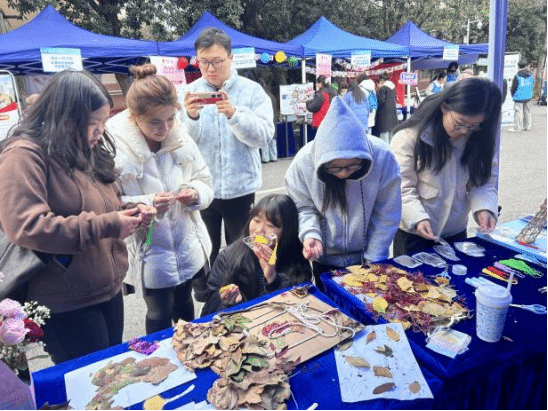 普润乡村·青春发声实践队开展“秋叶寄暖,艺润荆楚”活动。队员以校园落叶为材料,结合专业知识创作荆楚传统建筑拼贴模型,展现学科创意,传递生态环保理念。公益闭环展示区呈现“回收秋叶—制作文创—捐赠物资”全流程,互动体验环节中,参与者亲手用秋叶拼贴建筑装饰,体会志愿与专业融合的意义。