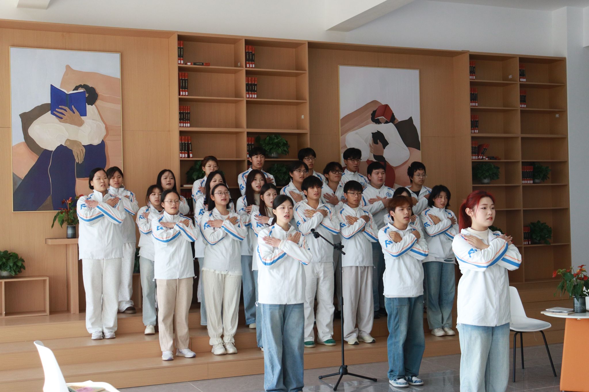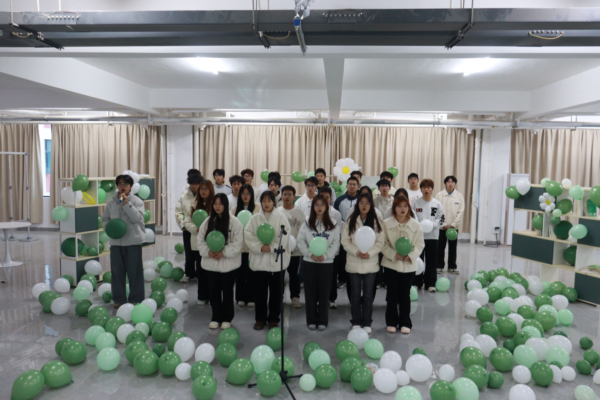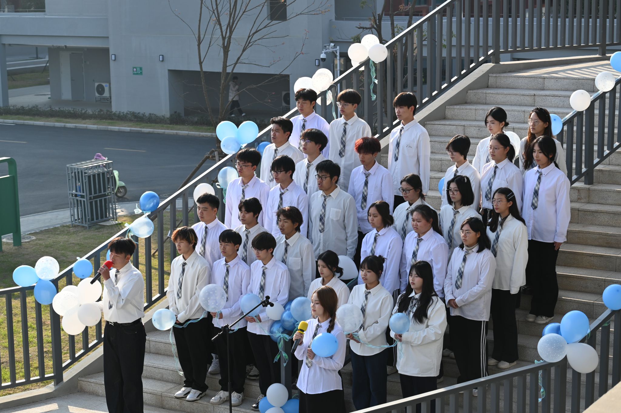 本次大赛自启动以来,历时两个月,经过各学院层层选拔,最终共有20支优秀团支部从院赛中脱颖而出,进入校赛。与传统合唱比赛不同,本次校赛采用“场景盲盒”机制,各支队伍在赛前通过抽签随机确定演出场地,覆盖图书馆、体育场、林荫道、教学楼中庭、实训楼广场等20处校园标志性场景。参赛队伍需根据场地特色,在不更换曲目的前提下,灵活调整表演形式、队形与呈现方式,实现“音乐与空间的对话”。
