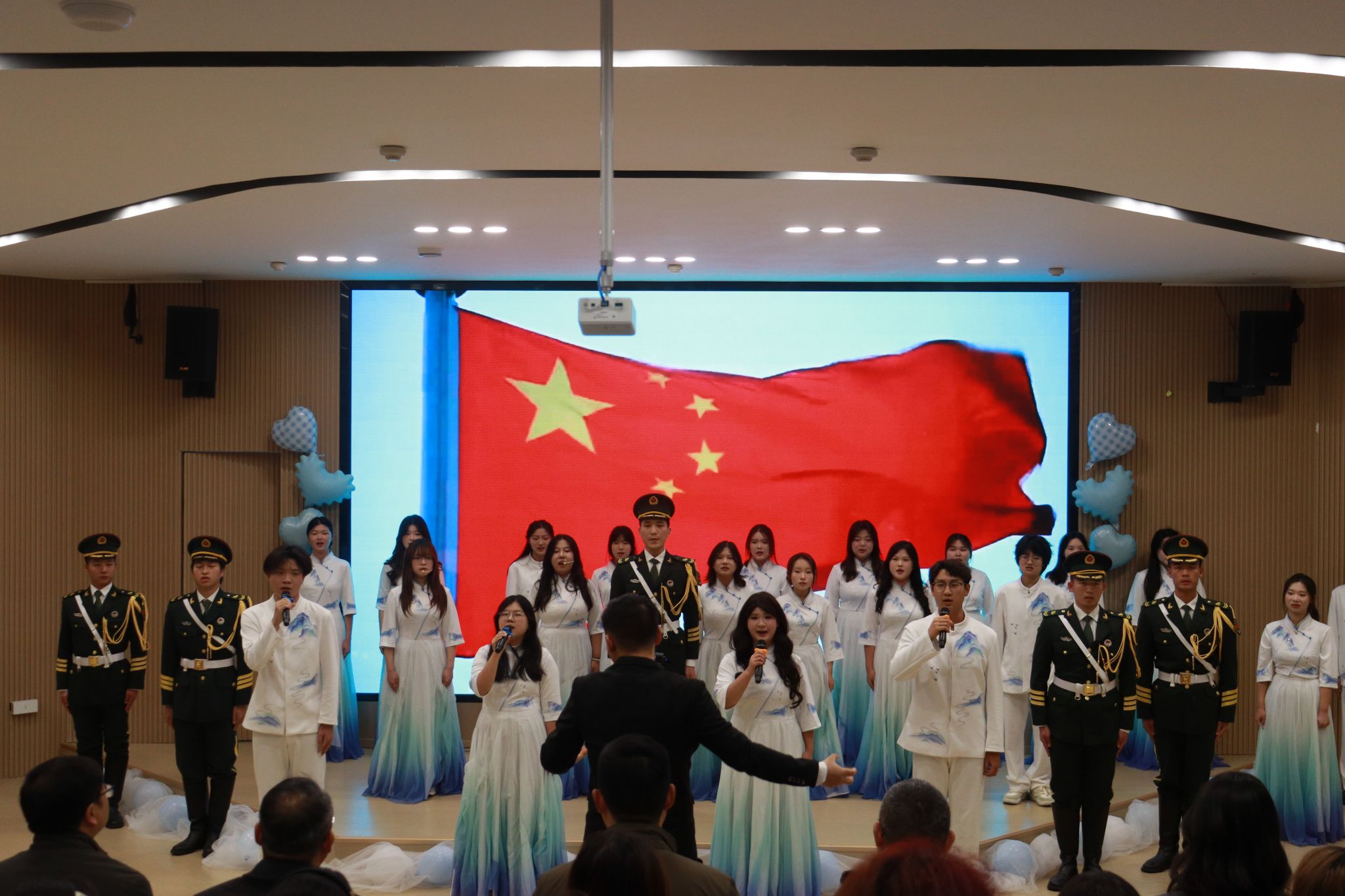 傍晚时分,所有队伍及观众齐聚学校多功能报告厅,举行闭幕暨颁奖仪式。在统计分数间隙,大学生艺术团声乐队带来一首铿锵有力的军歌《当那一天来临》。该节目由艺术团指导老师夏新明悉心指导,从情感表达、声部配合到舞台表现都进行了细致打磨。激昂的旋律与饱满的和声点燃全场,展现了扎实的艺术功底与深沉的情感力量。随后,在校退伍军人代表以“若有战,召必回”的铮铮誓言,将现场气氛推向高潮,充分彰显了青年一代的爱国情怀与责任担当。