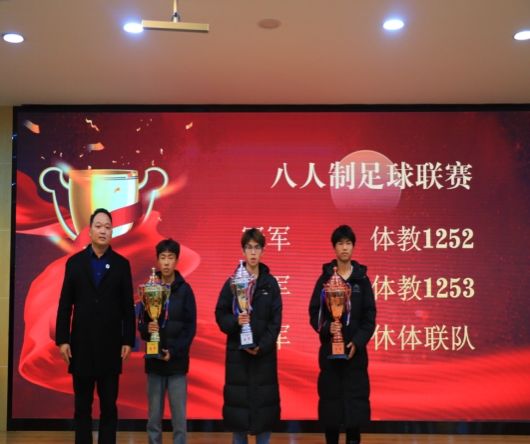 外国语学院党总支副书记马勇为八人制足球联赛冠亚季军获奖团队代表颁奖。