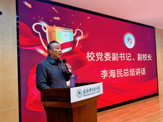 紧接着,校党委副书记、副校长李海民老师作总结讲话。李海民书记充分肯定了本届体育文化节的成果,指出活动以“活力华夏 运动逐梦”为主题,历时近两个月,涵盖健康晨跑、体育嘉年华、球类赛事等环节,有效践行了“五育并举、体教融合”的要求。他赞扬了参赛选手展现的顽强拼搏和团结协作精神,强调体育是育人实践的重要载体,并鼓励全体学生将“每天锻炼一小时,健康工作五十年,幸福生活一辈子”的理念内化于心、外化于行,以强健体魄和昂扬姿态为体育强国建设贡献青春力量。