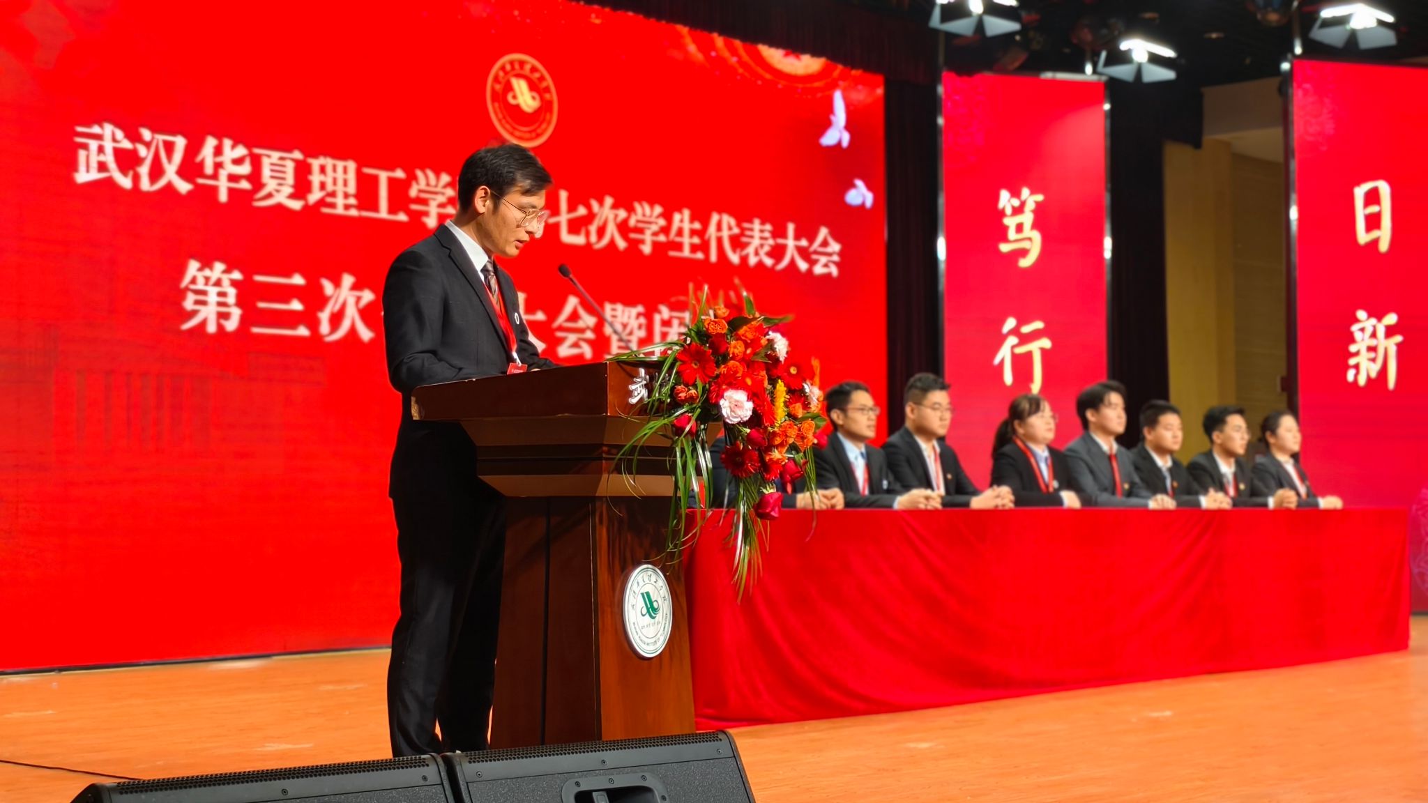 湖北省学联驻会执行主席夏天宇代表省学联向大会致贺词。他充分肯定了我校学生会在思想引领、组织建设、权益服务和校园文化等方面取得的扎实成效,并勉励广大青年学子勇担时代使命,在推进中国式现代化湖北实践中贡献青春力量。