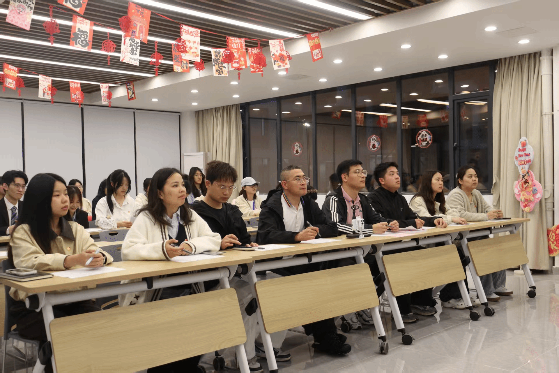 为深入学习贯彻习近平新时代中国特色社会主义思想,弘扬青春正能量,树立先进典型,全面展示我校各团支部过去一年的建设成果,4月21日18:30,校团委成功举办了2025-2026学年“悦学习·跃青春”活力团支部风采展示活动。本次活动创新采用分校区双线并行模式,实现了光谷校区与梧桐湖校区的同频共振与联动展示。校团委书记潘晶、学生工作处副处长郝志康、校团委副书记史贵鹏、校团委组织部部长张玉纯、校团委宣传部部长陈军,以及各学院团总支书记、团学骨干共同参与了本次答辩活动。