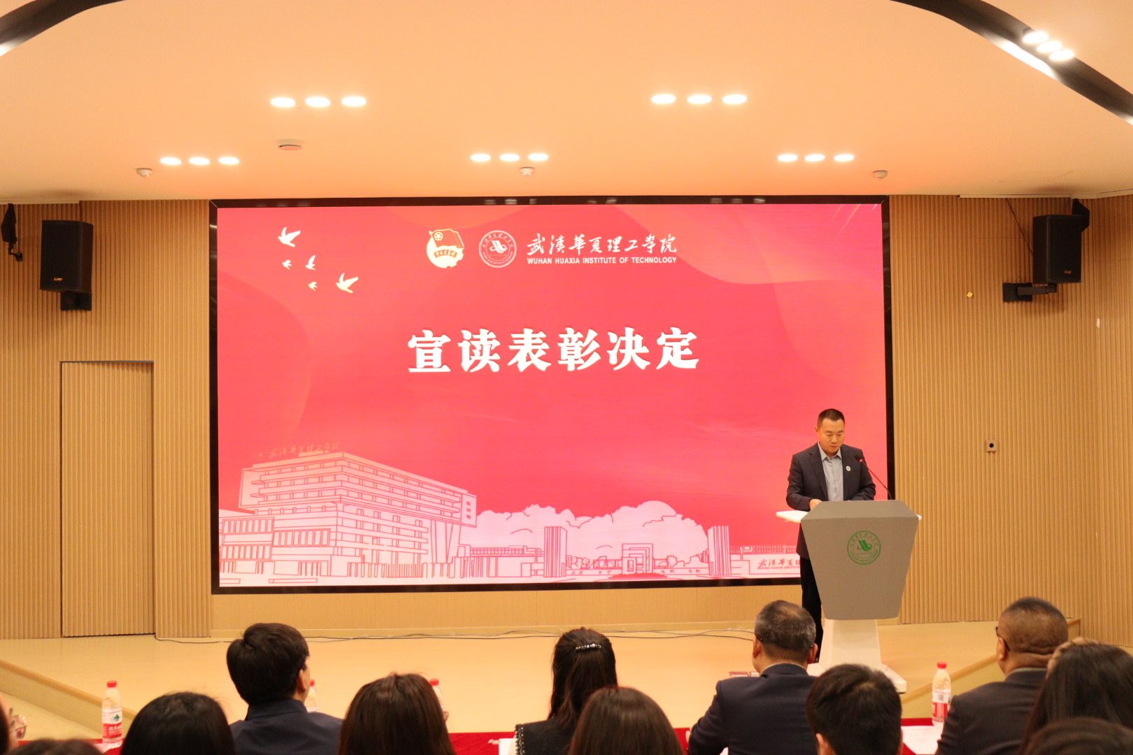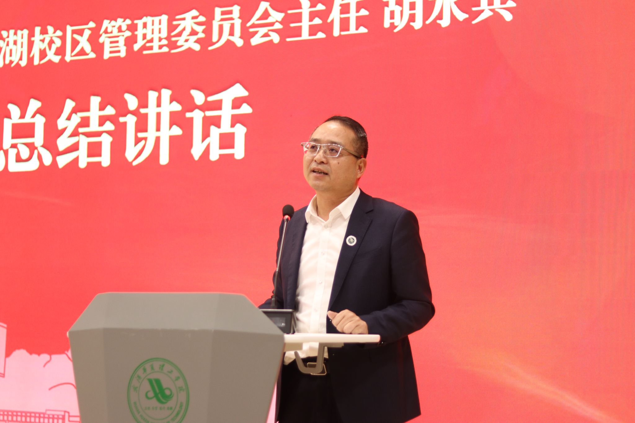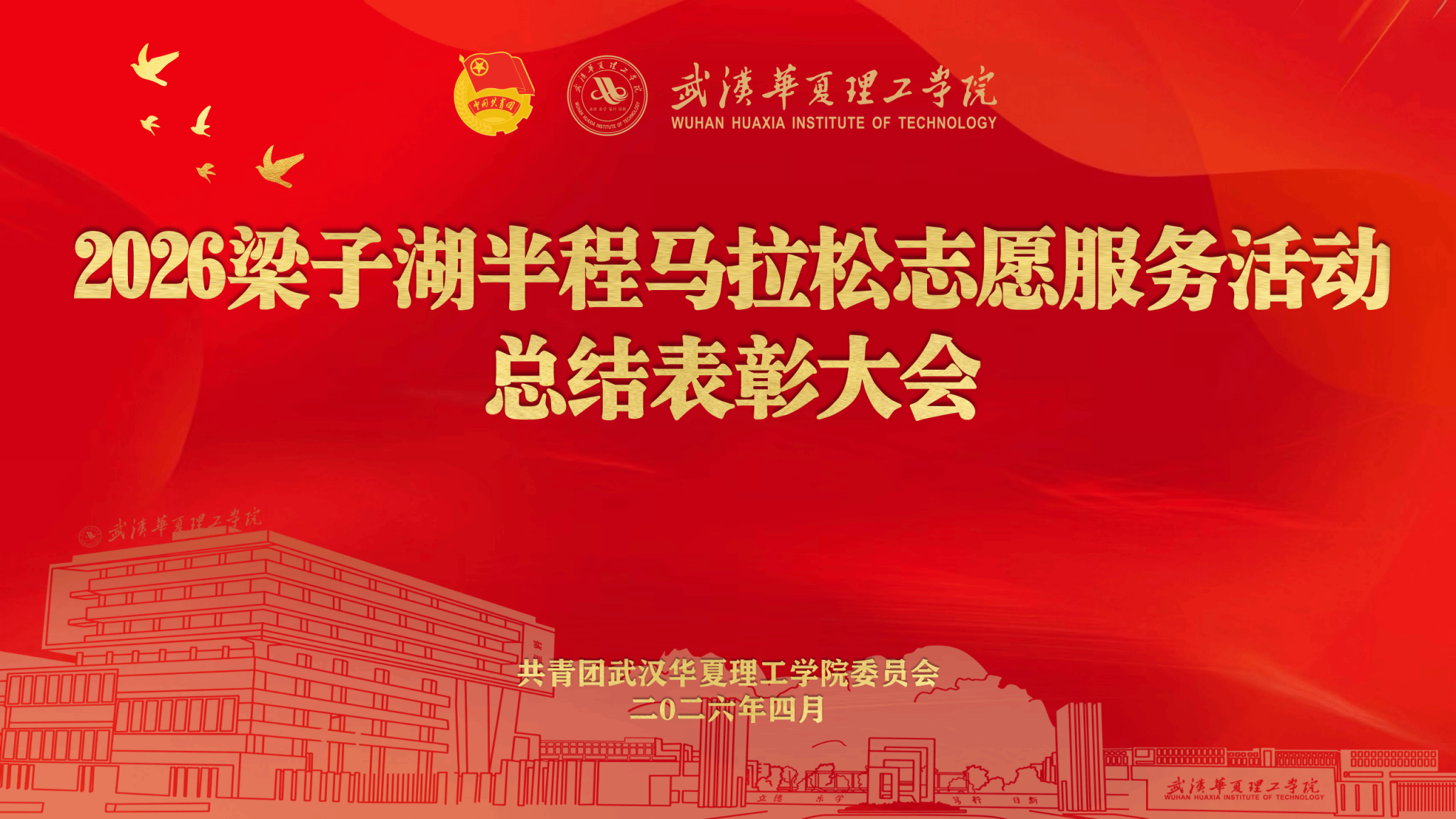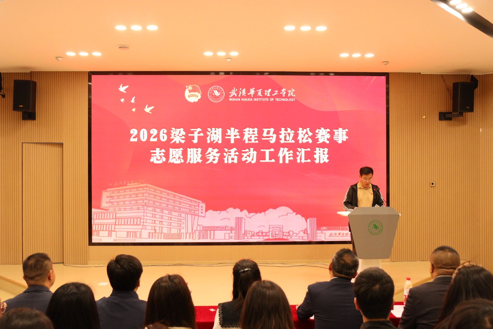 为全面总结 2026 梁子湖半程马拉松志愿服务工作成效,表彰先进典型、弘扬志愿精神,4 月 22 日晚,赛事志愿服务总结表彰大会在梧桐湖校区教学楼一楼多功能报告厅隆重举行。副校长、梧桐湖校区管委会主任胡水兵,梧桐湖校区管委会副主任项金辉、张城芳、黄程,梧桐湖校区管委会综合办公室主任张勇、综合办公室副主任孙华、学生服务中心主任郝志康、校团委副书记史贵鹏,全体辅导员及志愿者代表参加本次大会。
