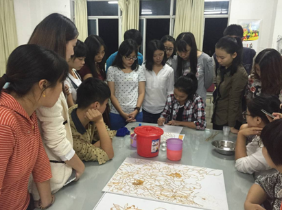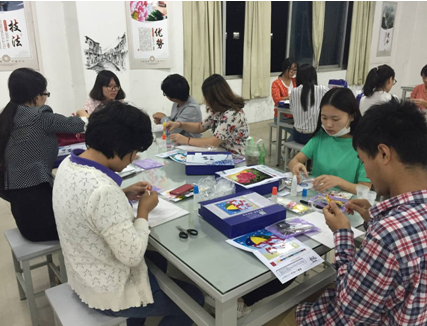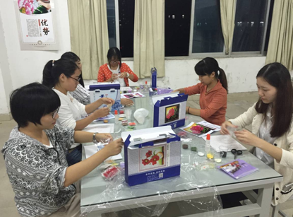 当晚,所有的同学都领到了第一次制作的工艺画的材料与工具,大家都制作得十分投入。整个场面都很安静,大家静静地操作着,一点点学着老师的样子,滴胶、掐丝、调色,两个小时,显得很短,当晚课程结束时,许多同学都意犹未尽……