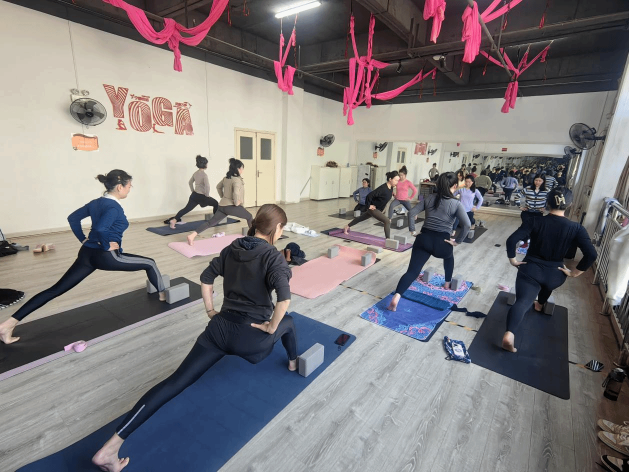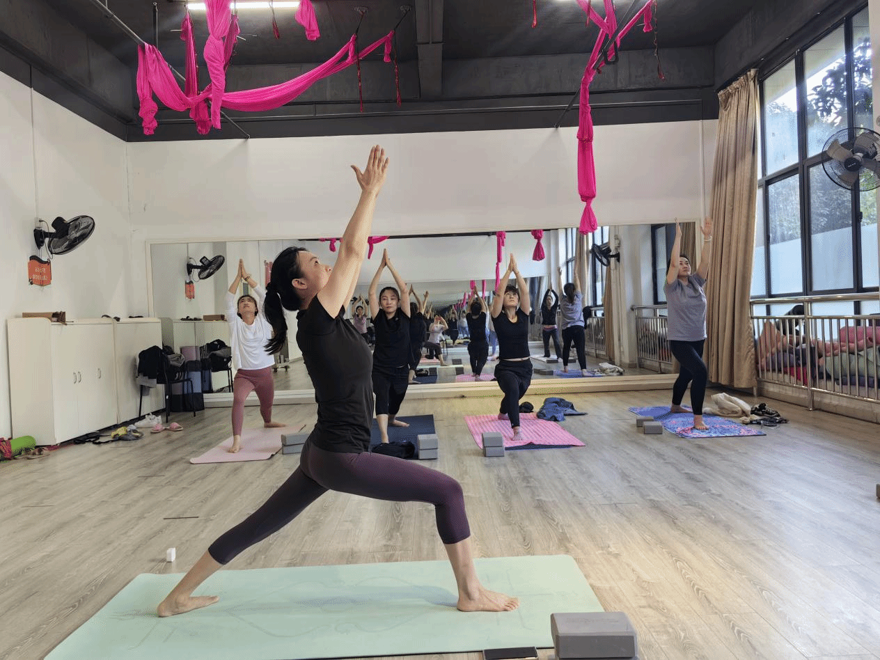 瑜伽俱乐部中,彭晶老师轻声引导,大家在静谧氛围里调整呼吸、完成体式,身心得到深度放松。