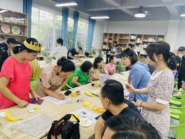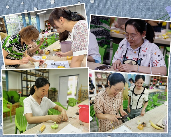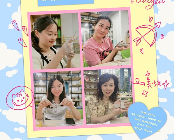生日仪式过后,大家落座边享受美食边准备开始陶艺冰箱贴制作。艺术学院王琳老师给大家准备了丰富的模型和材料,王老师介绍完制作方法之后大家就开始跃跃欲试,每个人制作陶艺时专注认真,发挥自己的想象力和创作,有的做蝴蝶、有的做玉兔、有的做树叶、云朵……每一块都是独一无二的作品。大家时而交流作品时而埋头创作,玩的不亦乐乎。