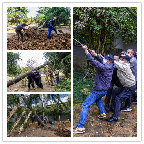 照片《拯救大树》描述的是校园墙角的一棵大树被风吹倒了,工程机械不能近距离施工,后勤的老同志们人抬肩扛想方设法要把这棵树救活,终于大树重新屹立在校园。辛勤的劳动者珍惜自己的每一项成果,热爱每一个生命,用自己的劳动美化校园的每个角落。