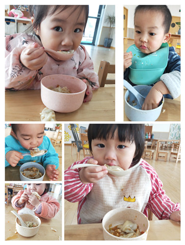 在我们托管中心一日吃三餐的宝贝们,冬至这天,水饺必须给安排上。一大早,膳食老师黄老师,就在厨房里忙活着炖肉馅儿、擀面皮。乐宝是一只嗅觉很灵敏的小馋猫,由于她最小(1.5岁),喜欢自由探索,在其他宝贝们在教课老师带领下跳操环节时,这只小馋猫站在厨房门外一直在大喊“好香”“黄老师做好吃的,好香”。