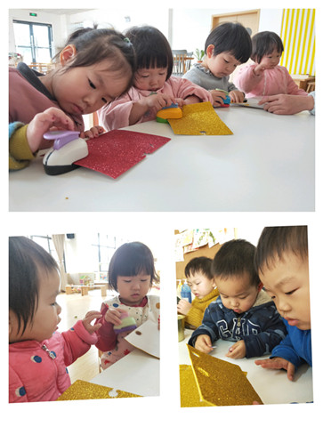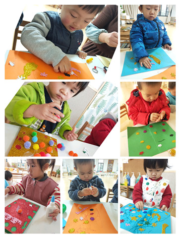 亮亮的贴纸,毛茸茸的球球,红与绿、蓝与黄,这样配、那样搭,孩子们天马行空的想象力,无设限的构图,果然每一位宝宝都是潜力股。他们的作品每一个都是独一无二的,带着这份纯真的祝福,可以想象到他们的爸爸妈妈看到后一定会露出幸福的笑容。