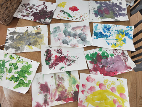 2岁左右的孩子们的作画,老师们没有给孩子们具象话,都是任由他们自由发挥,肆意想象。不得不说,孩子们总有他们独特的视角,他们的画笔一落,本以为会是一副“鬼画符”,其实在他们小小的心里,那就是他们探索自然、探索颜料最好的作品。