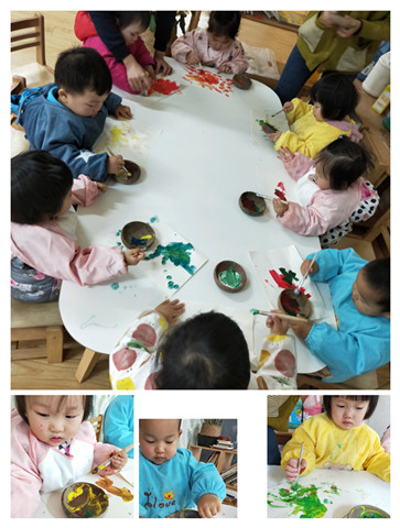 树叶捡回来后,接下来就是整理树叶啦,我们帮每一个孩子们挑选了自己认为形状和颜色都最好看的一片带进了教室。接着,我们还要进行一张大工程呢——用颜料笔把我们的最佳树叶给拓印下来。选好颜色、刷子,孩子们大笔一挥就开始啦。