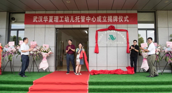 9时45分,张晓东、郭彪、阮进、罗波共同为当代教育·武汉华夏理工幼儿托管中心揭牌。