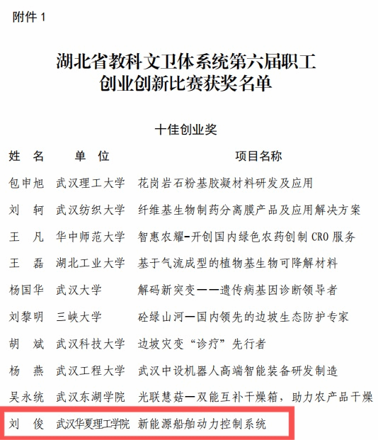 10月25至27日,湖北省教科文卫体系统第六届职工创业创新比赛在武汉东湖学院举办,我校首次参加比赛。全省教科文卫体系统102个项目通过层层选拔,决出“十佳创业奖”“十佳创新奖”和40个“优秀项目奖”。我校智能制造学院刘俊团队《新能源船舶动力控制系统》项目脱颖而出,荣获“十佳创业奖”。
