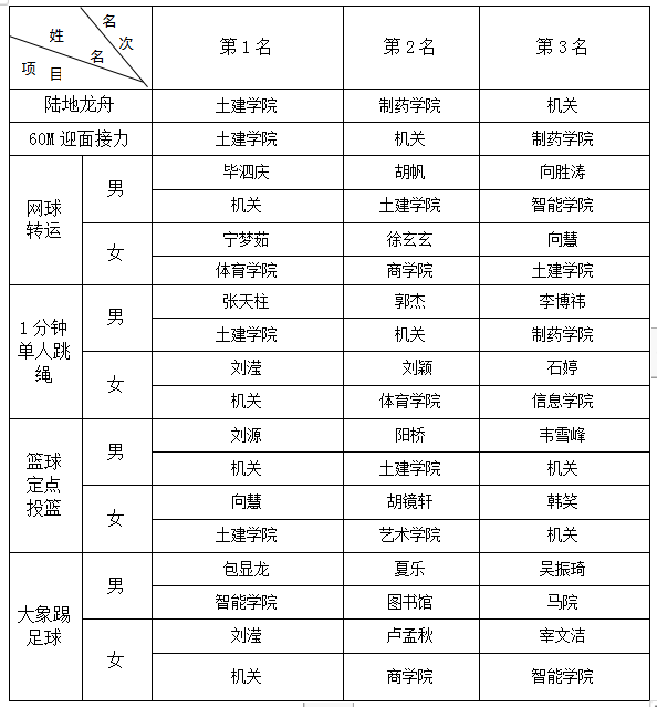 为进一步丰富教职工的业余文化生活,促进教职工全面健身活动的开展,增强教职工的身体素质和学校凝聚力,校工会与体育学院于4月19日联合举办了“2024年教职工运动会”,并评出个人奖(四项):一等奖(8名)、二等奖(8名)、三等奖(8名);团体奖项(二项):一等奖(2名)、二等奖(2名)、三等奖(2名)。具体名单如下: