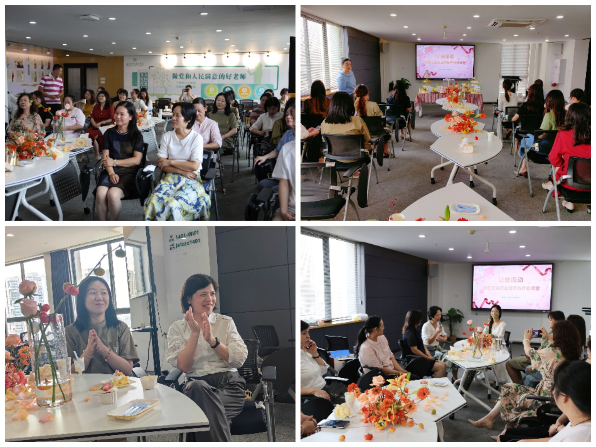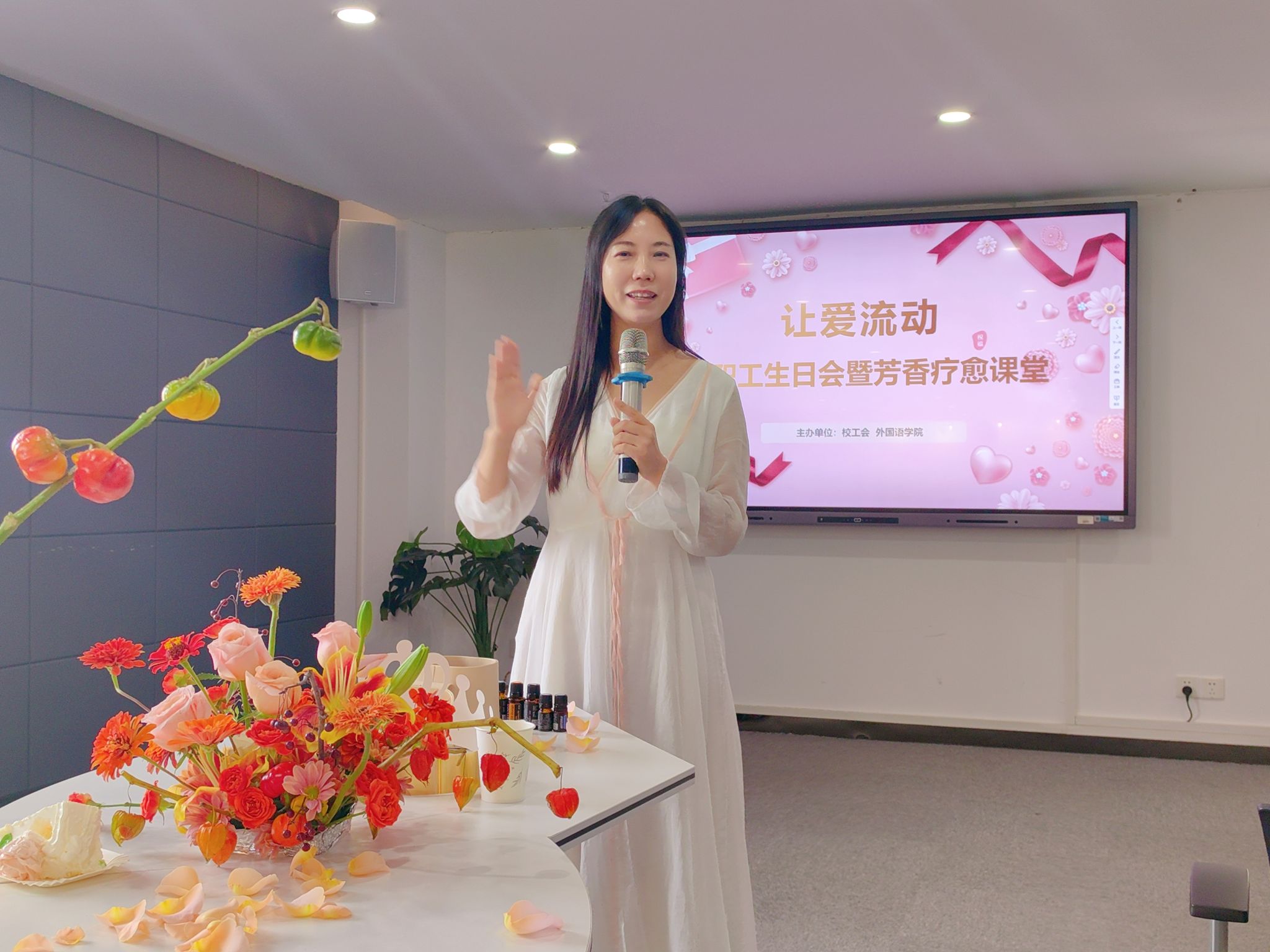 9 月 25 日下午,一场充满爱与温暖的活动在我校综合楼 1401 会议室开展。校工会联合外国语学院分工会精心筹备了 “让爱流动 —— 教职工生日会暨芳香疗愈课堂”,为 6月 至 9 月生日的老师们送上了一份特别的祝福,同时也为热爱精油疗愈的老师们带来了一次难忘的身心放松之旅。