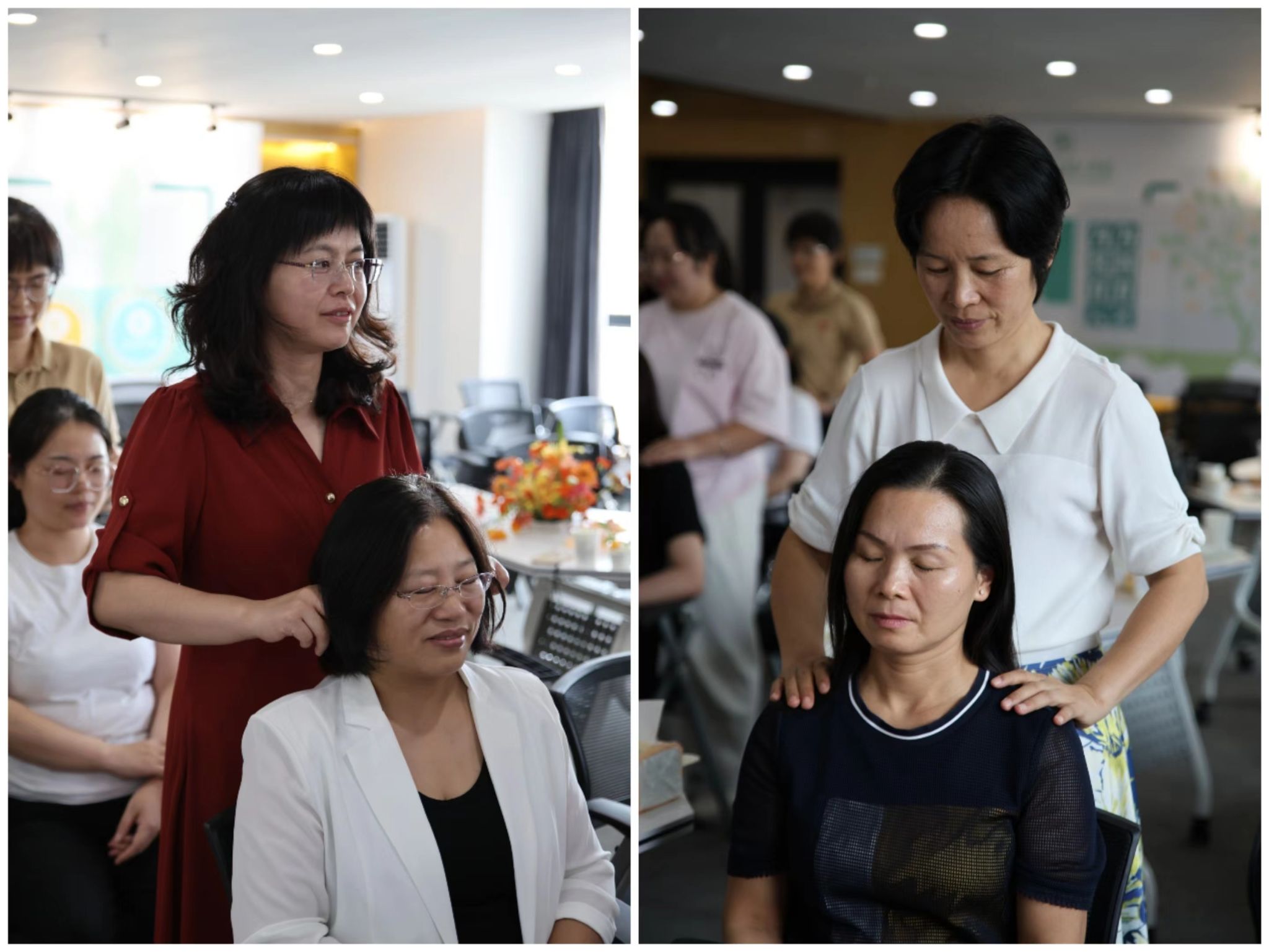其次是芳香抚触互动,让老师们体会爱的流动之美。同事之间的亲密接触,传递着温暖与关爱,加深了彼此的感情。平日里,老师们总是无私地将爱给予家人,而在这个课堂上,他们感受到了来自同事如家人般的爱,令人感动不已。