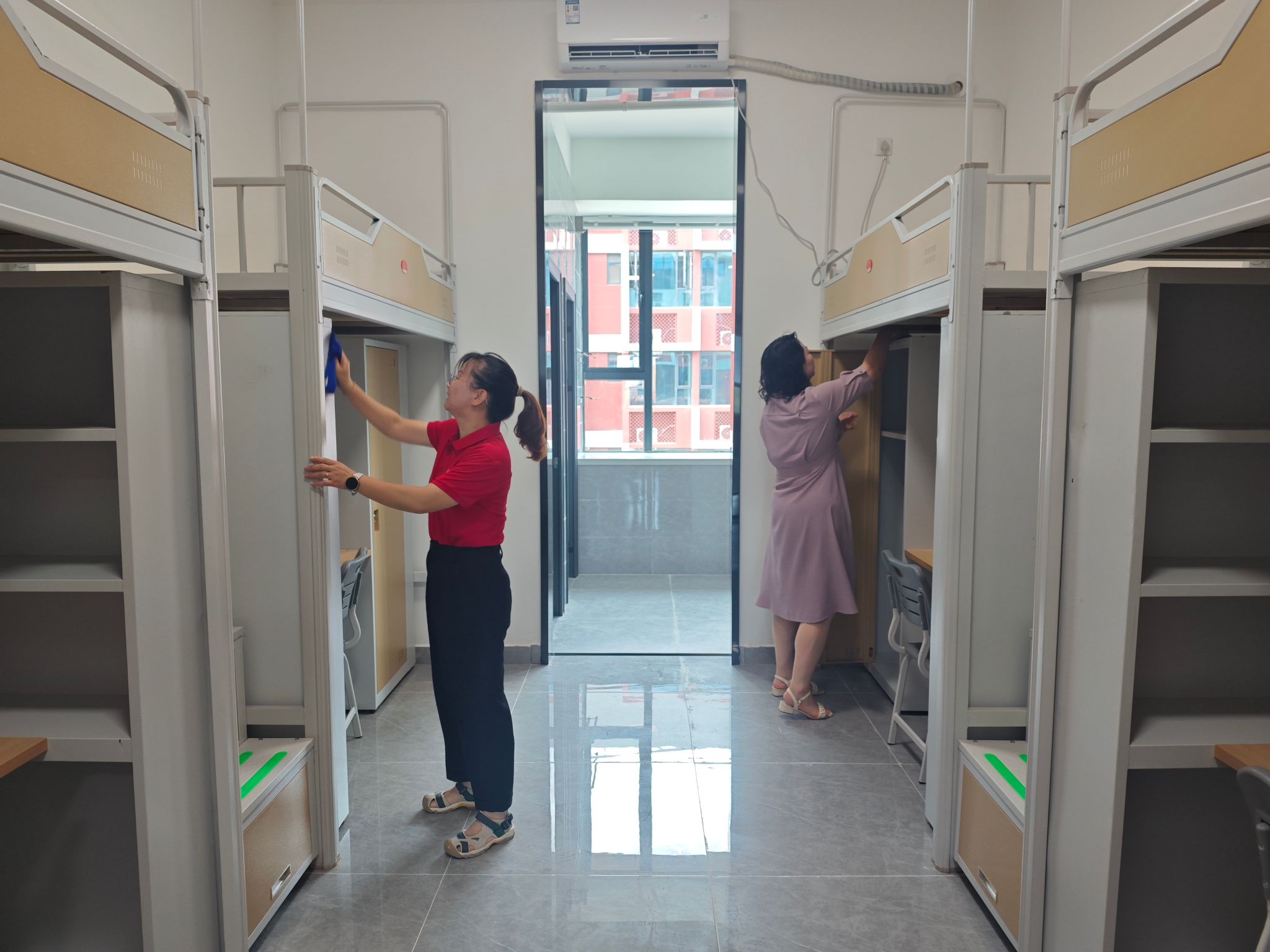 校长吴永桥,副校长丁成忠,党委副书记、副校长李海民,副校长李猜等校领导们以身作则、主动带头,与各学院教师一同走进新生宿舍,全力投入清洁和排查工作。各学院教师志愿者们分组逐间作业,对宿舍地面、衣柜、床体、卫生间、阳台等区域进行二次清洁,并逐一测试水电设备、空调、密码锁等设施,确保各项设备运转良好。党委书记丁德智还实地检查了双创中心、食堂后厨、洗消通道、留样冰箱等重点场所,开展安全隐患排查,并对发现问题现场督办整改,做到“发现一处、销号一处”。