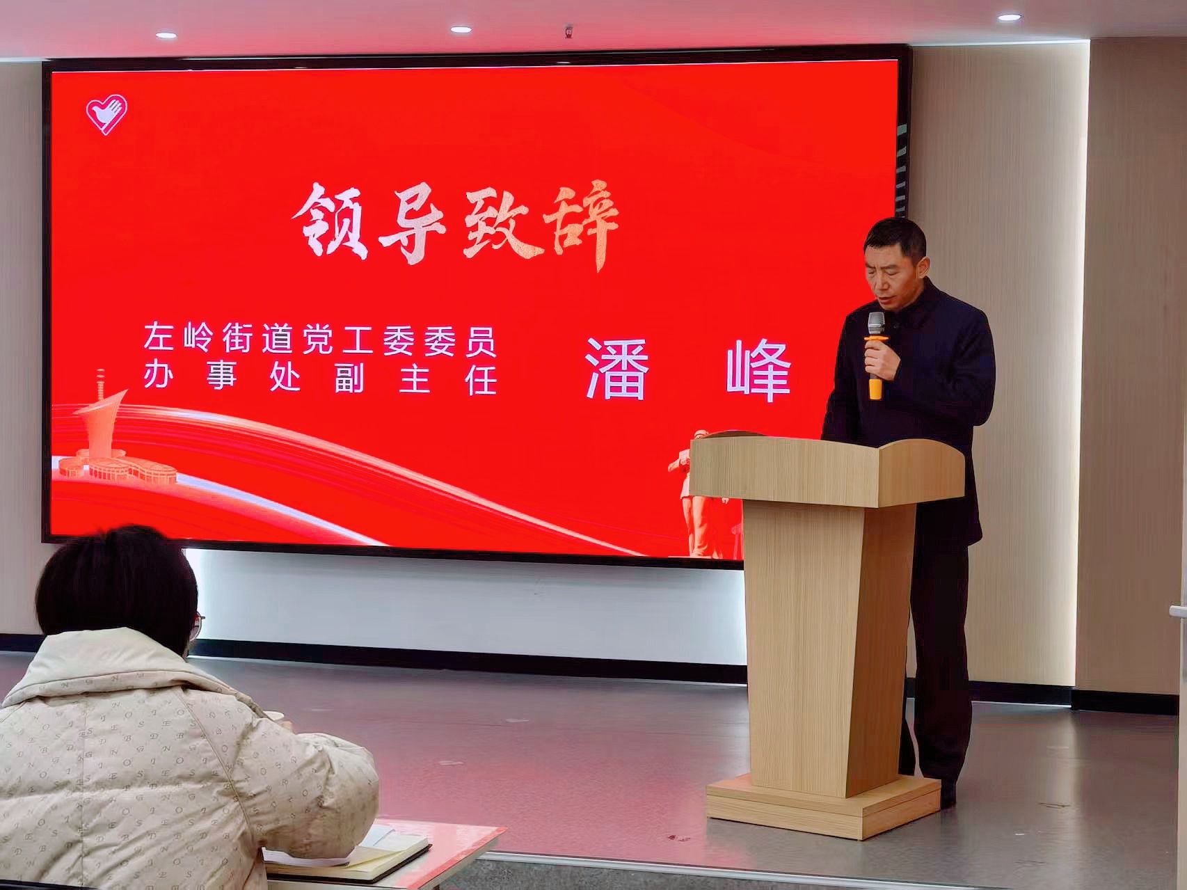 左岭街道党工委委员、办事处副主任潘峰在欢迎词中指出,要充分发挥校社共建平台优势,在实践育人中提升服务效能,广泛凝聚各界力量,绘就基层治理新图景。