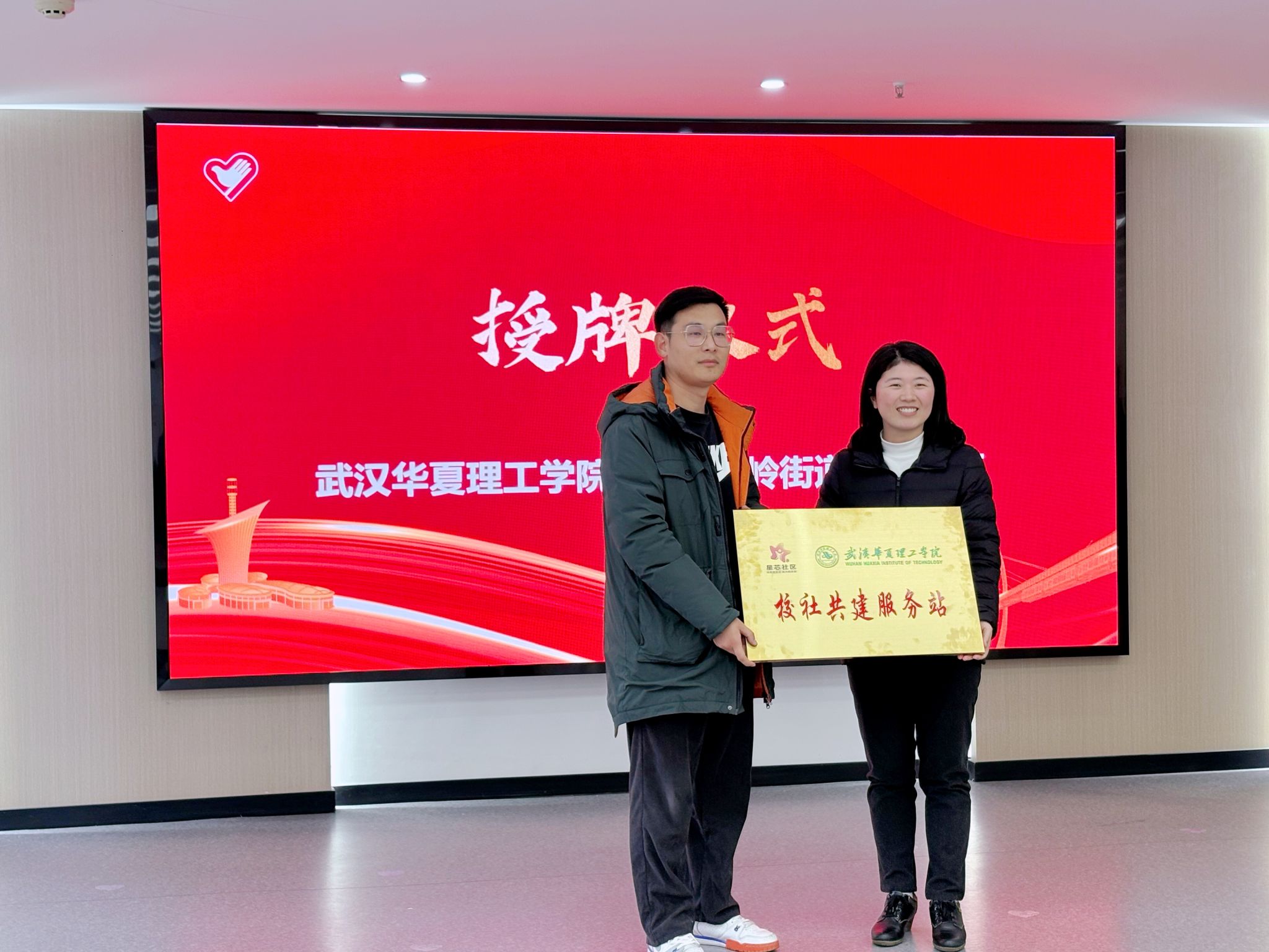 授牌仪式上,东湖高新区团工委书记刘佳雄为我校授予“校社共建服务站”牌匾,陈伟为星芯社区授予“大学生社会实践基地”牌匾,标志着校社共建进入新阶段。