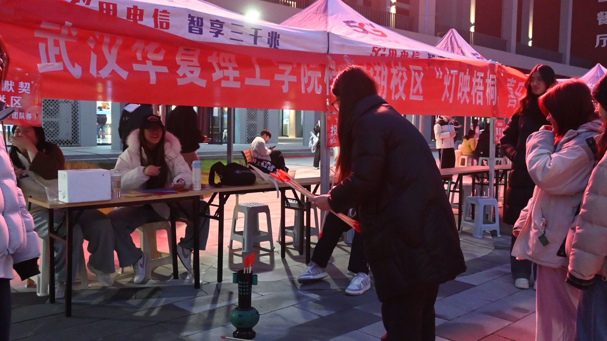 与此同时,土木建筑工程学院在三号宿舍楼活动中心打造了专属元宵分会场,为学子们带来了别样的节日欢乐。分会场里,投壶、毛笔书写元宵祝福、翻瓶子等趣味游戏轮番登场,吸引了众多同学驻足参与。学院的特色活动,将传统民俗与青春趣味巧妙融合,成为本次校园元宵游园会中一道独具特色的风景线。
