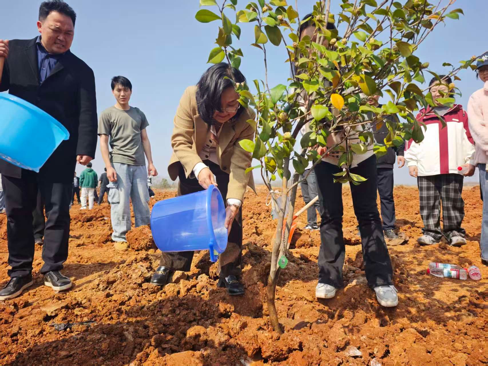 下午2时,植树活动正式拉开帷幕。现场气氛热烈,师生分工协作,配合默契。校领导率先垂范,与师生一起挥锹铲土、扶苗填坑、踏土夯苗、提桶浇水,每个环节都做得认真细致、一丝不苟。经过一番辛勤劳动,近50株新栽种的茶花树和樱花树迎风挺立,错落有致,为初春的校园增添了勃勃生机。