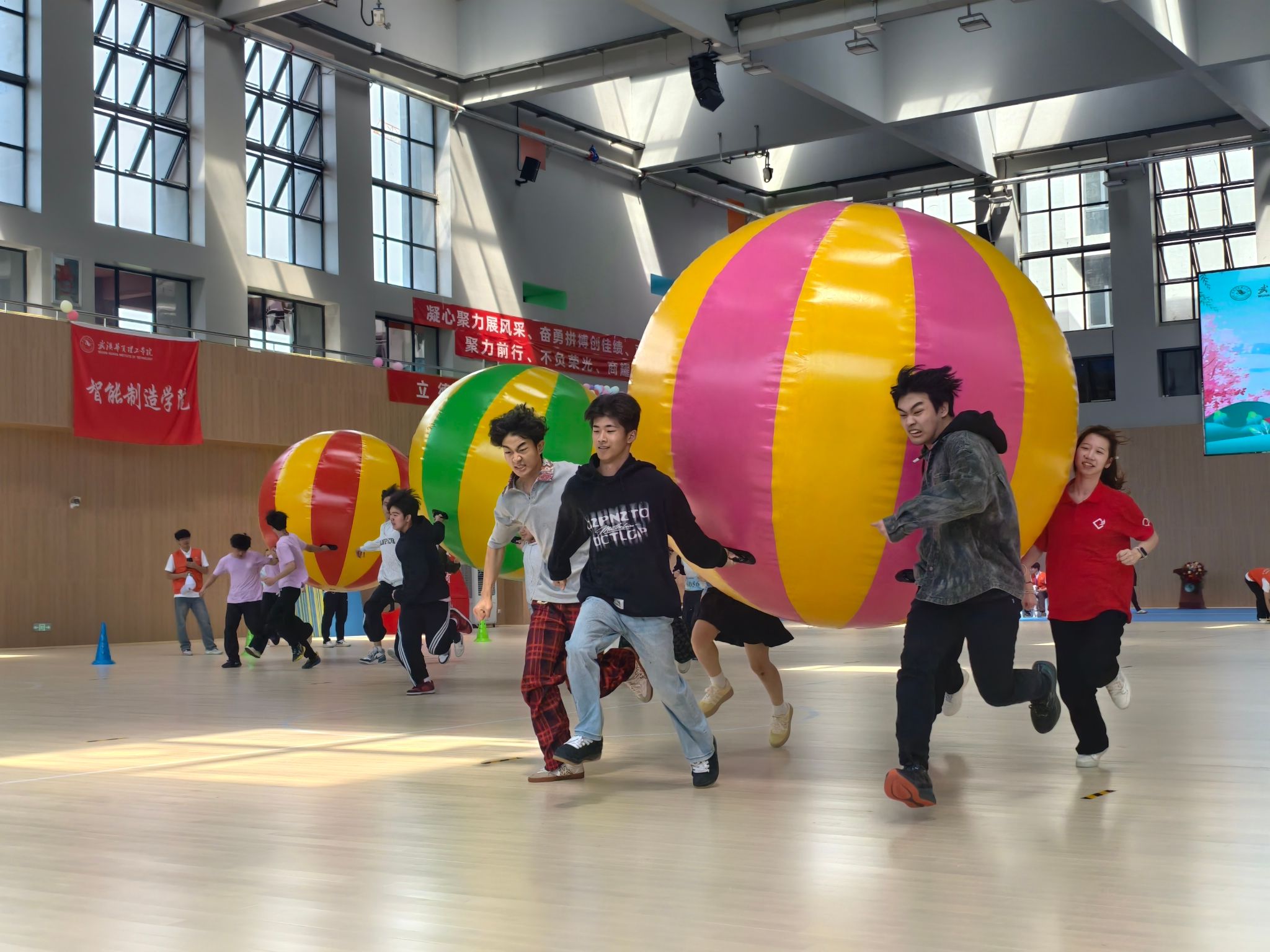 趣味项目“运转乾坤”作为首个比赛率先登场。体育馆内,队员们合力托举巨型彩球,在默契的传递与飞奔中笑声不断,将运动的快乐与团队凝聚力推向高潮。