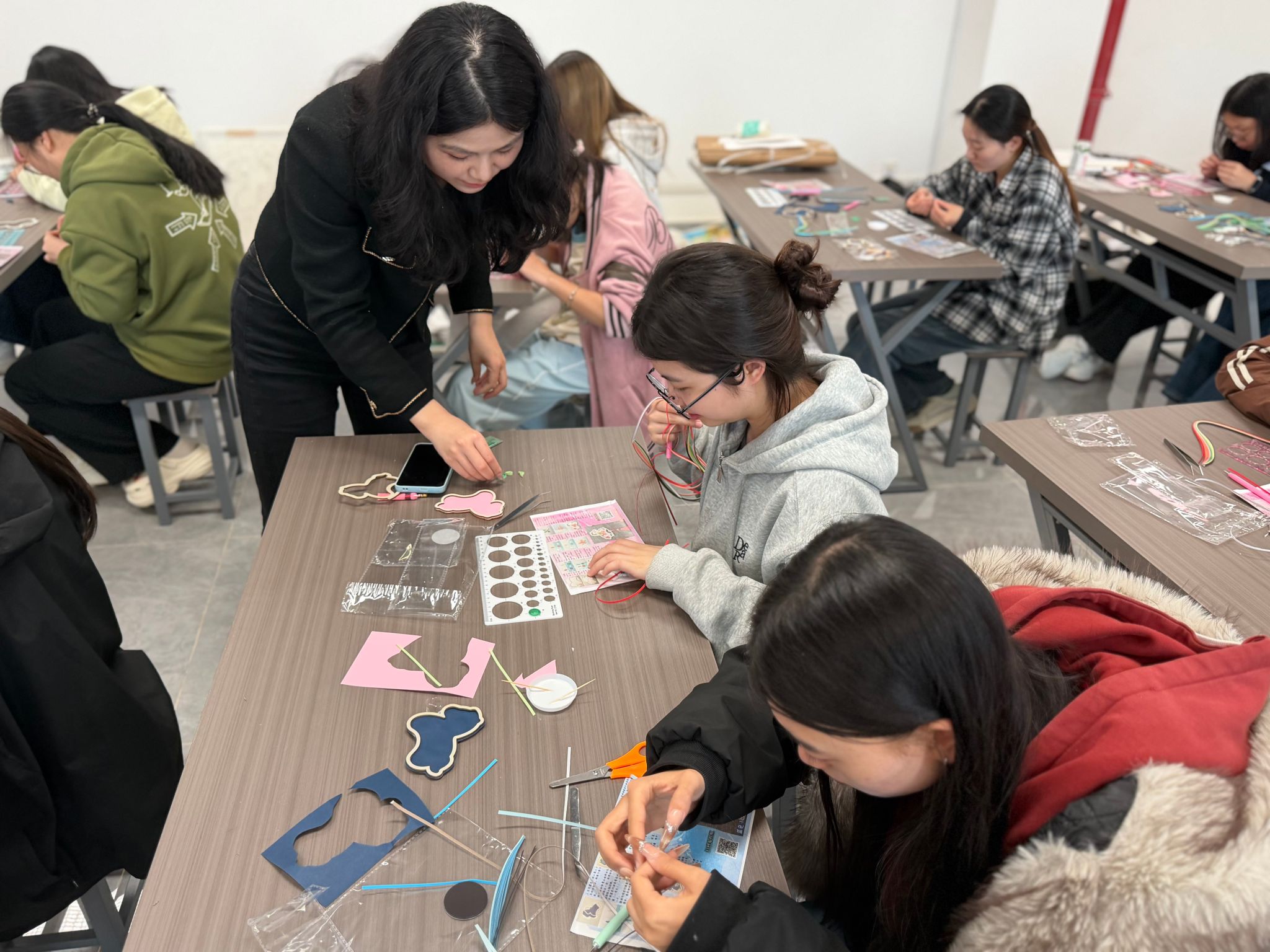 在实操环节,许莉逐一示范了工具使用方法和基础创作手法,并现场播放了由其亲自录制的完整教程视频。视频将复杂制作步骤拆解清晰,使零基础学生也能跟上教学节奏。活动现场,学生们全神贯注地弯折纸条、搭配色彩、精细粘贴。许莉巡回指导,解答疑问,纠正操作误区,同时鼓励学生灵活创新。经过近两个小时的制作,普通彩色纸条在学生手中逐渐变成造型精致的瑞马图案,最终完成了一批小巧别致的衍纸冰箱贴。