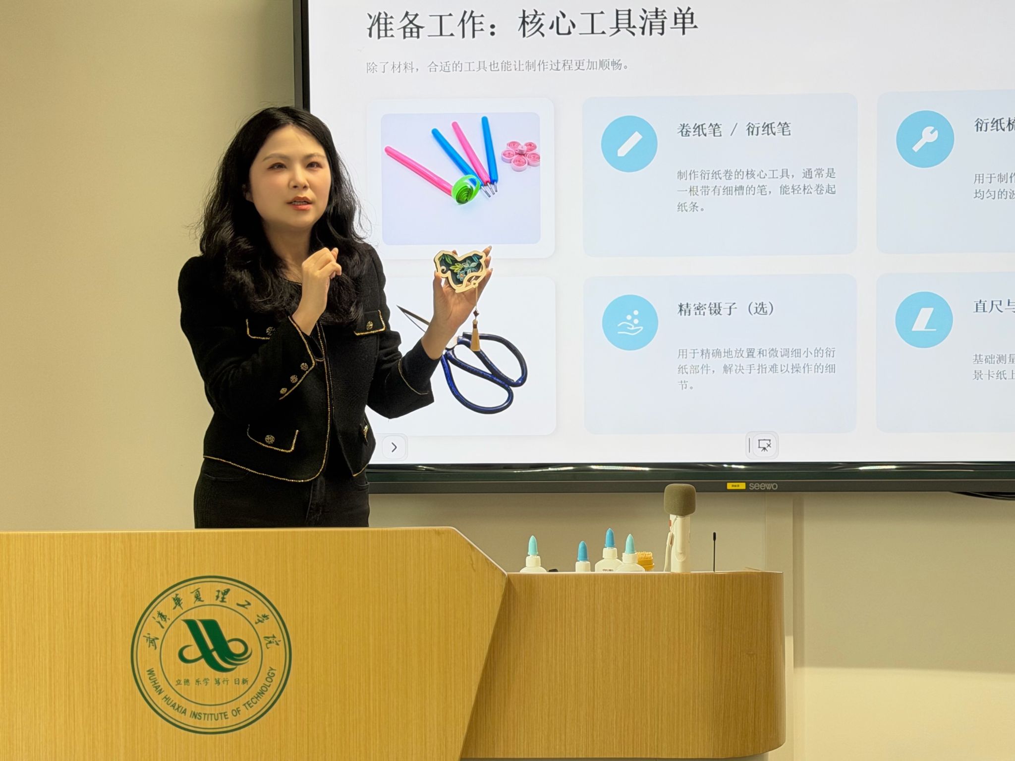 活动分为理论讲解与实操指导两个环节。在理论环节,通识教育学院教师许莉系统梳理了衍纸艺术的发展脉络,介绍了核心知识。她指出,衍纸又称卷纸艺术、纸丝工艺,通过卷、捏、拼、贴等手法,将彩色纸条塑造成具有立体感的艺术造型。