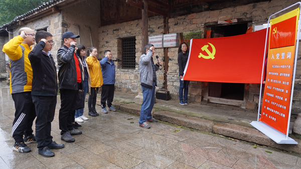 在新四军第五师尹家湾革命旧址群,图书馆党总支党员干部们开展了“学四史 守初心”主题教育,先后参观了新四军第五师司令部、中共中央中原局和中原军区成立旧址、李先念、郑位三、陈少敏、任质斌旧居等革命旧址,详细了解新四军第五师在尹家湾留下的光辉战斗足迹,深刻感悟老一辈无产阶级革命家不怕牺牲、一心为民的爱国爱党精神。参观结束之后,全体党员干部在赵传斌同志的带领下,神情肃穆、举起右拳,整齐地面向党旗庄严宣誓。吴汉桥同志深情朗诵红色诗歌《誓言》,让党员们重温革命历史,不忘理想、信念、宗旨,不忘初心、牢记使命,为党员干部们上了一堂别具一格的“党课”。