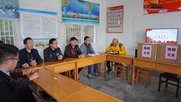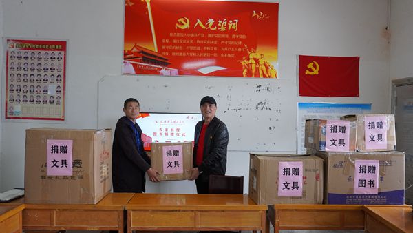 在双乡村政务服务中心,教职工一行与双乡村村委干部们共同举行了简短而隆重的爱心捐赠仪式。吴汉桥代表学校将筹集的文具及相关书籍捐赠给双乡村的留守儿童,双乡村党支部书记黄彬代表双乡村接受了捐赠并表示了感谢。随后的座谈会上,广水市统计局副局长、广水市扶贫工作队队长刘建国简要介绍了双乡村的基本情况,并对近年来学校在该村开展的帮扶工作表示肯定与感谢。赵传斌介绍了学校图书馆的基本情况及此次捐赠物品的筹集过程。他表示,此次爱心捐赠的相关物资是在学校党政领导的支持下,在图书馆全体馆员的共同参与下筹集的。他希望通过此次爱心捐赠活动,让双乡村的几十名留守儿童感受到爱心温暖的同时,也能充分享受阅读、学习带来的乐趣。图书馆也将在学校党政的统一领导下,一如既往地大力配合、支持精准扶贫工作。吴店镇副镇长杨东涛,吴店镇原纪委书记许琦等相关同志参加了座谈。
