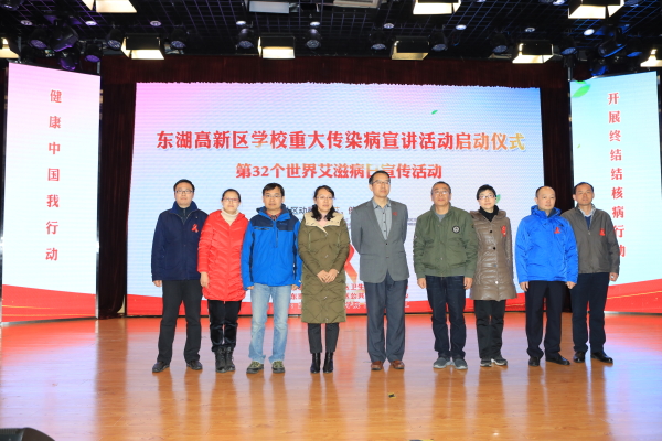 11月27日上午,“东湖高新区学校重大传染病宣讲活动启动仪式暨第32个世界艾滋病日宣传活动”于我校学术报告厅召开。湖北省疾控中心艾防所所长蒋洪林,武汉华夏理工学院党委副书记、副校长李海民,武汉市结核病防治项目办主任李月华,武汉市疾控中心艾防所所长许骏,武汉市结核病防治项目办科长张正斌、鲁周琴,东湖高新区卫计局科长梁杰,东湖高新区公共卫生服务中心主任吴晓东、书记余建华出席本次活动。各学校学生工作负责人、学校志愿者团队及我校师生代表参加了活动。